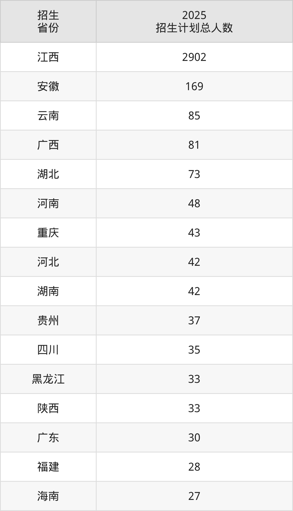 2025年江西中医药大学面向全国28个省市开展本科招生;招生专业共29个,招生人数共3856人。2025年在江西省招生计划总人数是2902人,其中,江西中医药大学在江西省招生人数最多的是中医学。江西中医药大学在各省具体招生人数情况如下表。