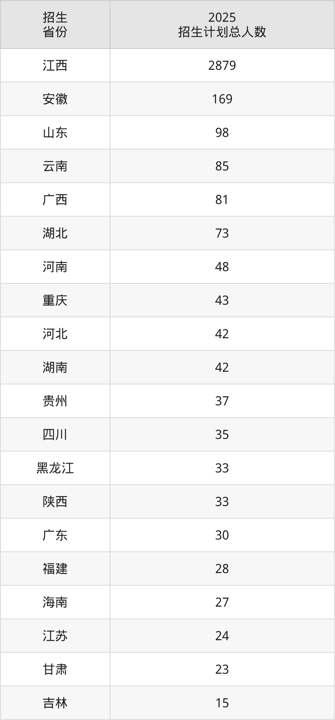 2025年江西中医药大学面向全国29个省市开展本科招生;招生专业共29个,招生人数共3931人。2025年在江西省招生计划总人数是2879人,其中,江西中医药大学在江西省招生人数最多的是中医学。江西中医药大学在各省具体招生人数情况如下表。