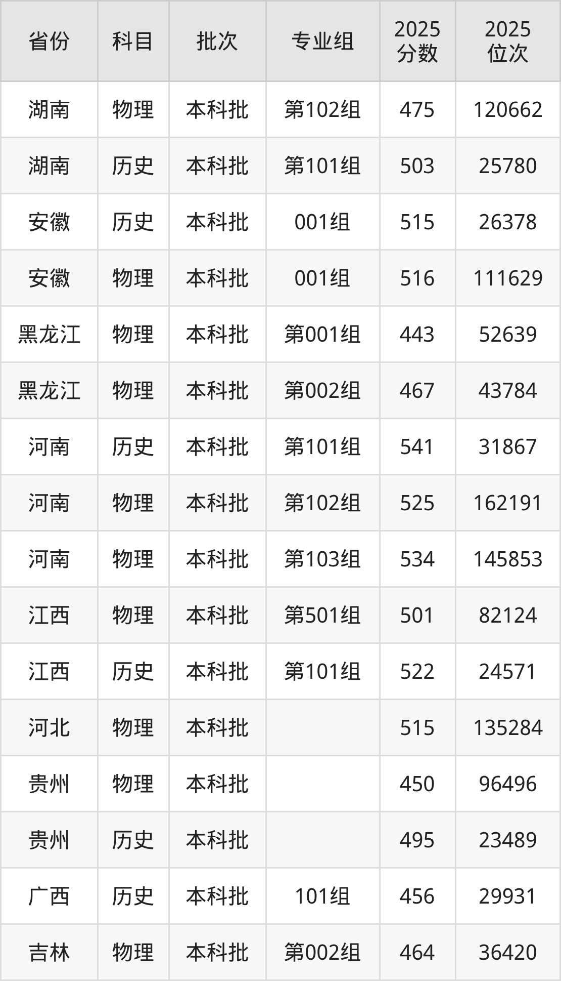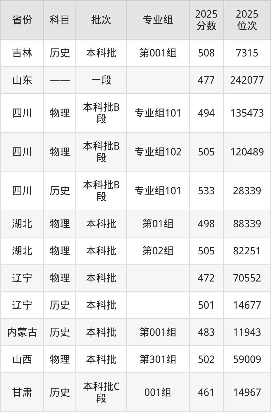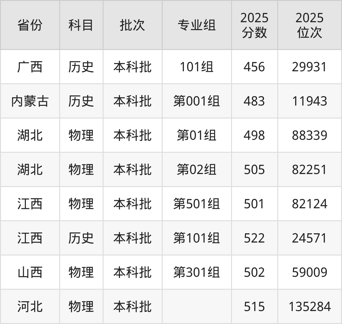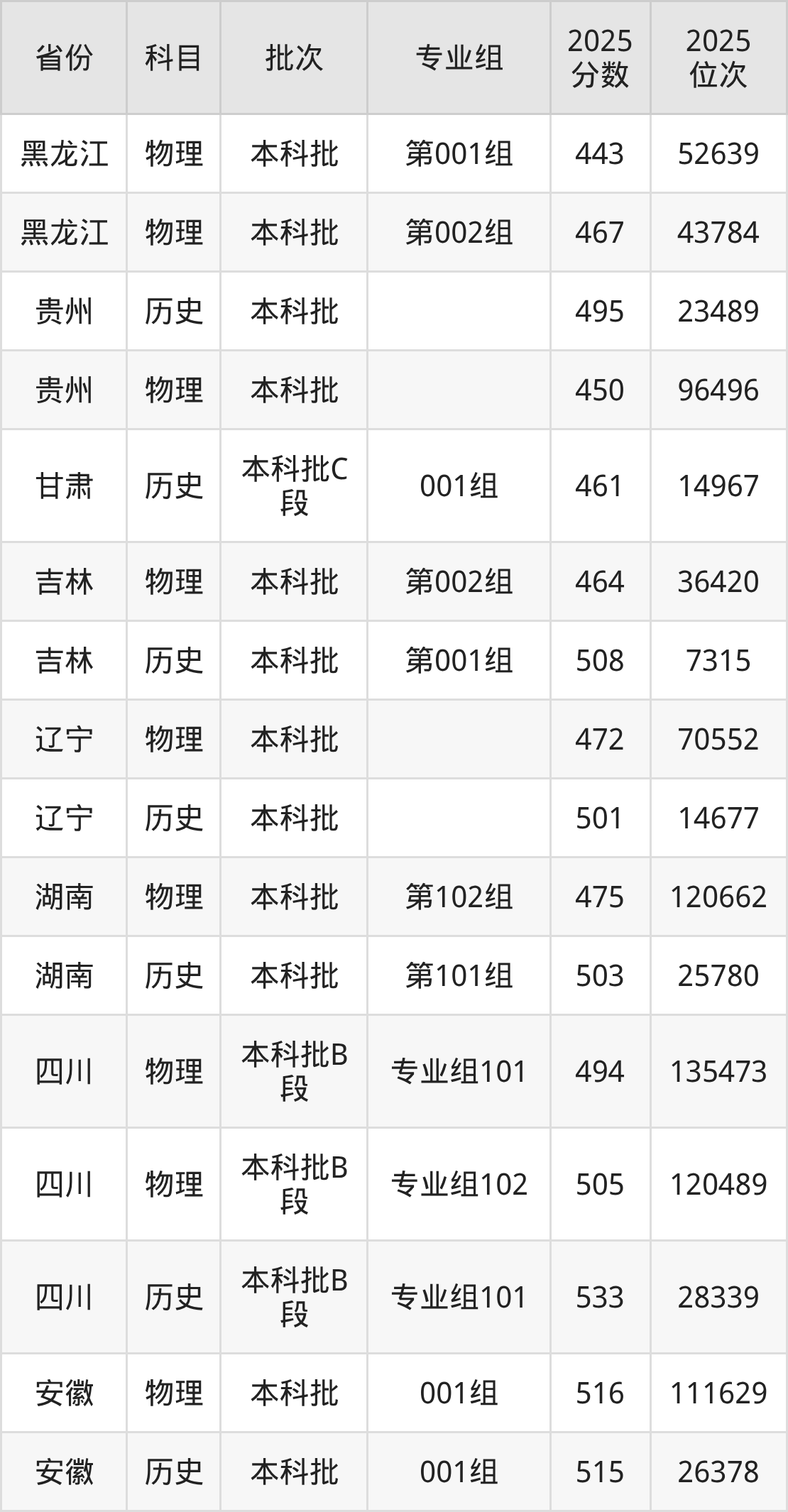 2025年在本科物理类进行招生,各专业组分数线详情如下: