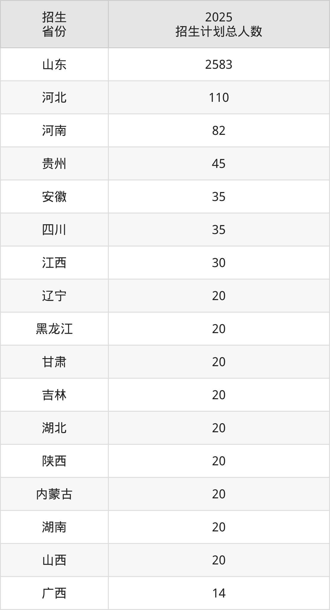 2025年山东管理学院面向全国17个省市开展本科招生;招生专业共35个,招生人数共3114人。2025年在山东省招生计划总人数是2583人,其中,山东管理学院在山东省招生人数最多的是会计学。山东管理学院在各省具体招生人数情况如下表。