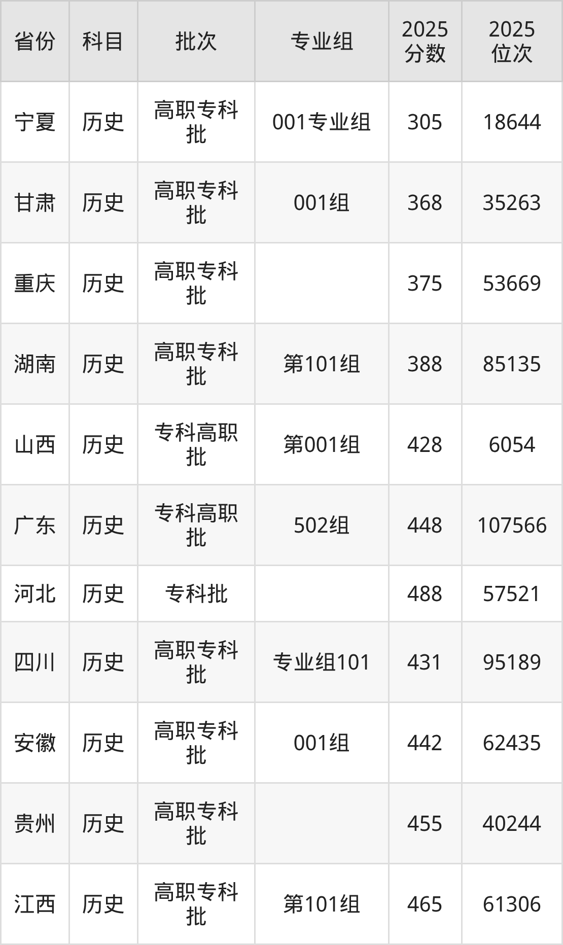 2025年在专科历史类进行招生,各专业组分数线详情如下: