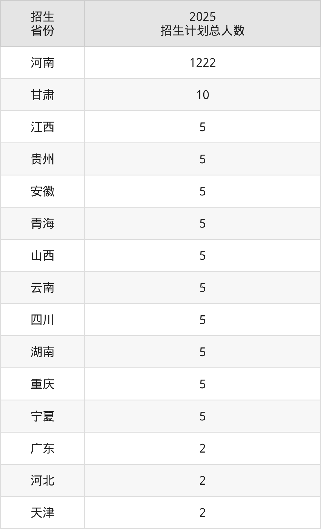 2025年焦作师范高等专科学校面向全国15个省市开展专科招生;招生专业共34个,招生人数共1288人。2025年在河南省招生计划总人数是1222人,其中,焦作师范高等专科学校在河南省招生人数最多的是小学数学教育。焦作师范高等专科学校在各省具体招生人数情况如下表。