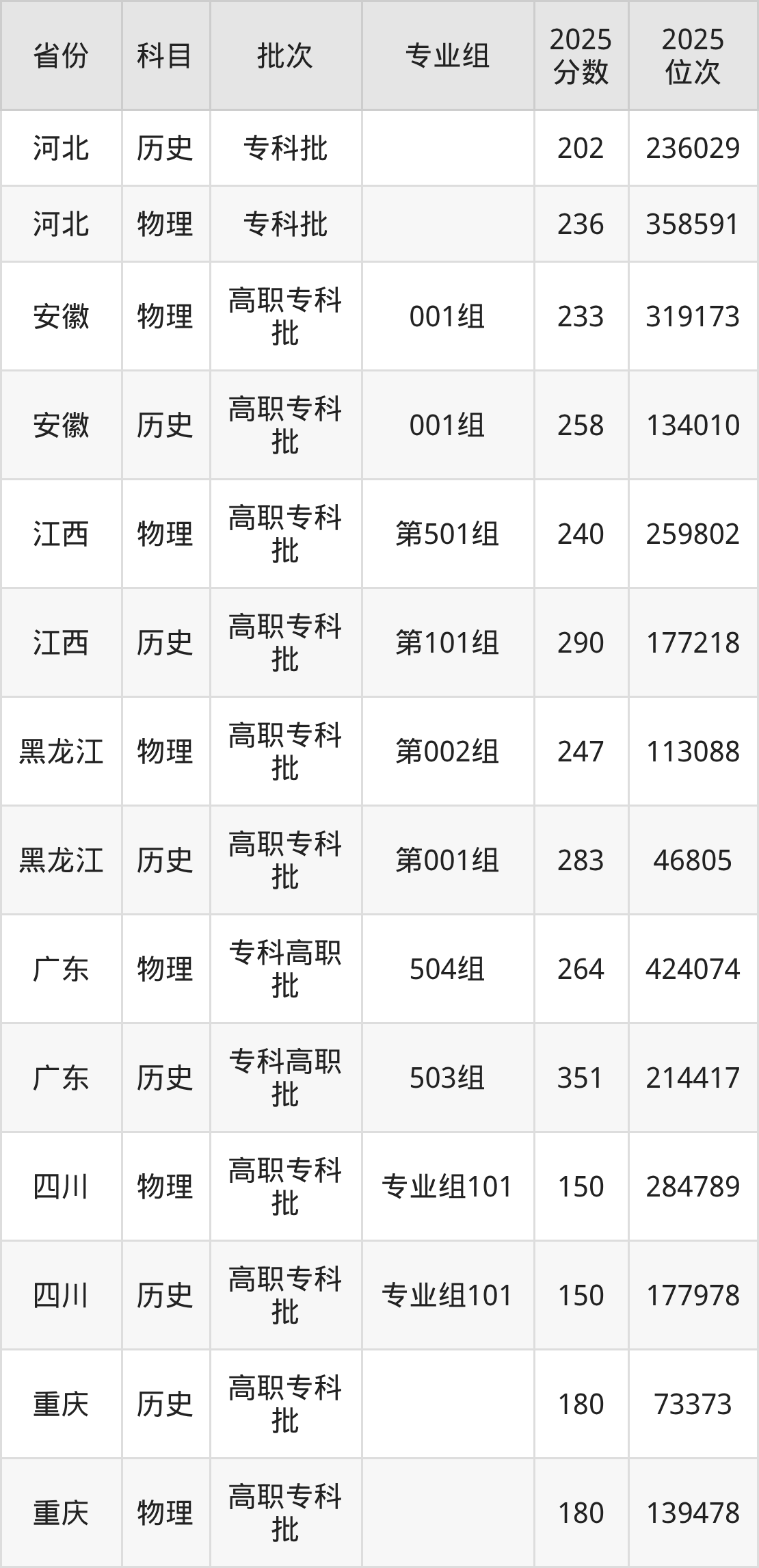 2025年四川希望汽车职业学院全国录取分数线是150分到351分,录取最低在四川物理类(专业组101)、录取最高在广东历史类(503组)。各省各专业组最低分具有差异,详情如下: