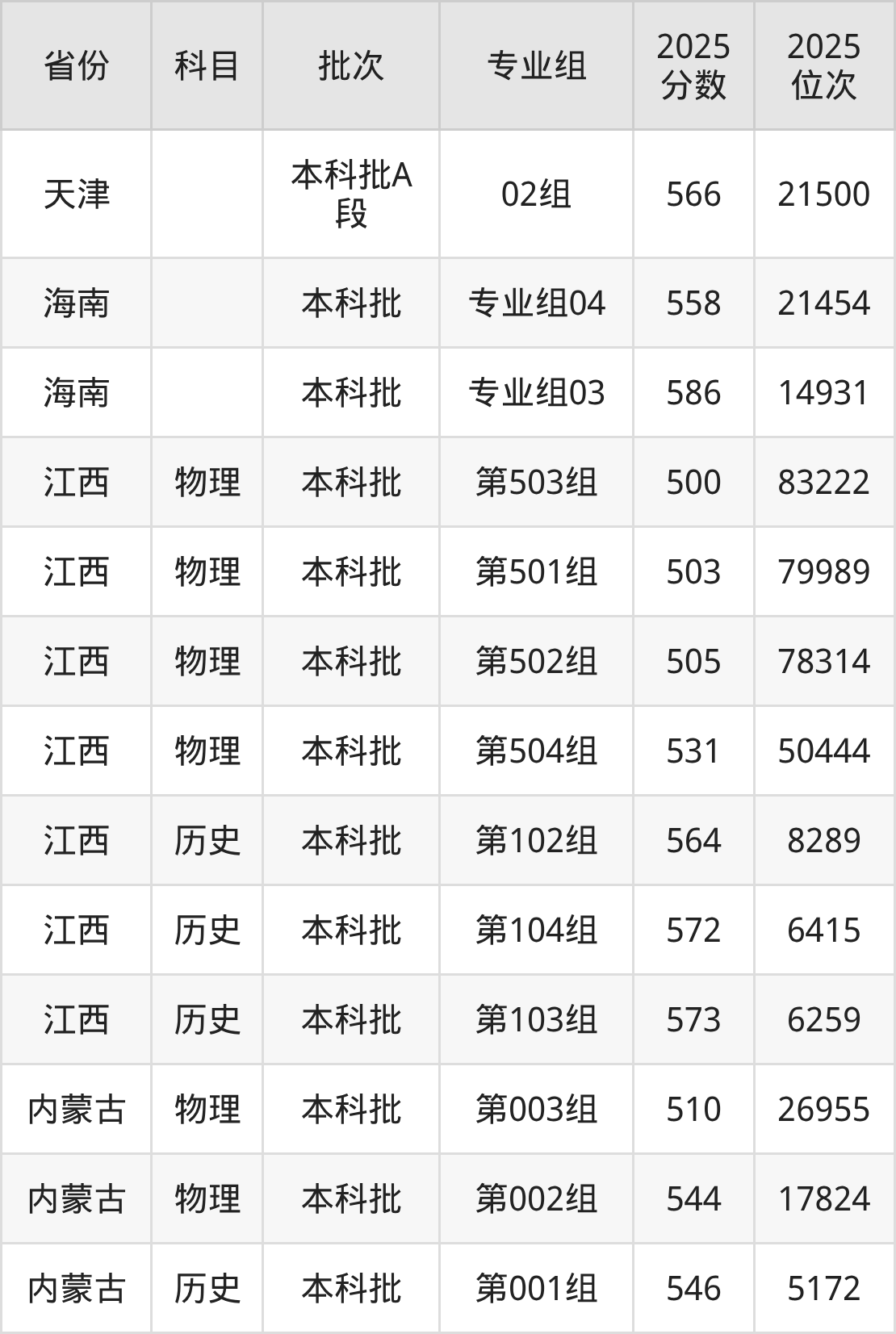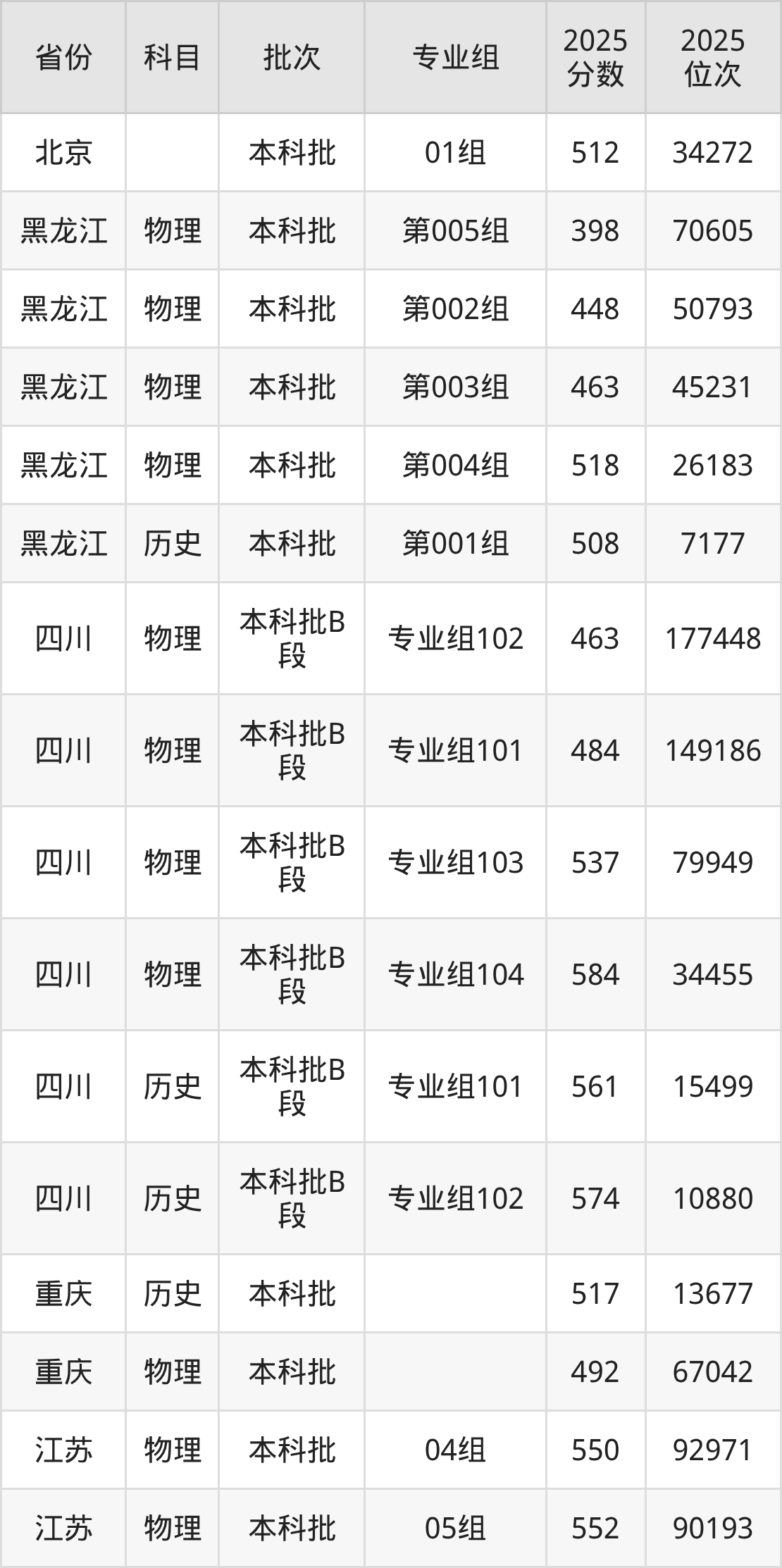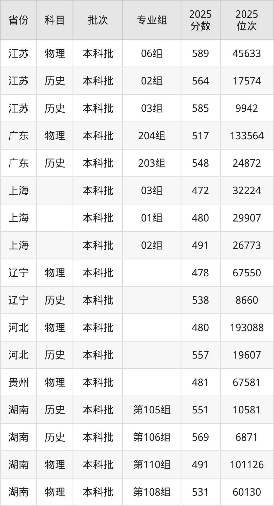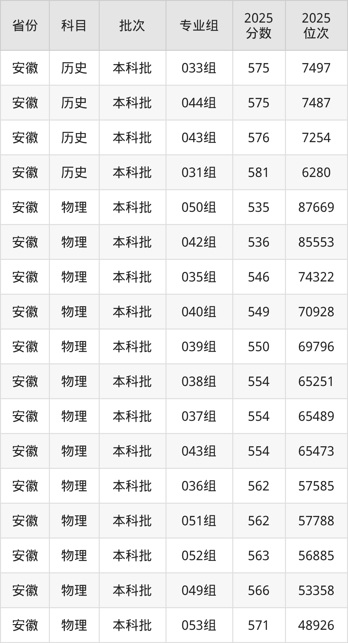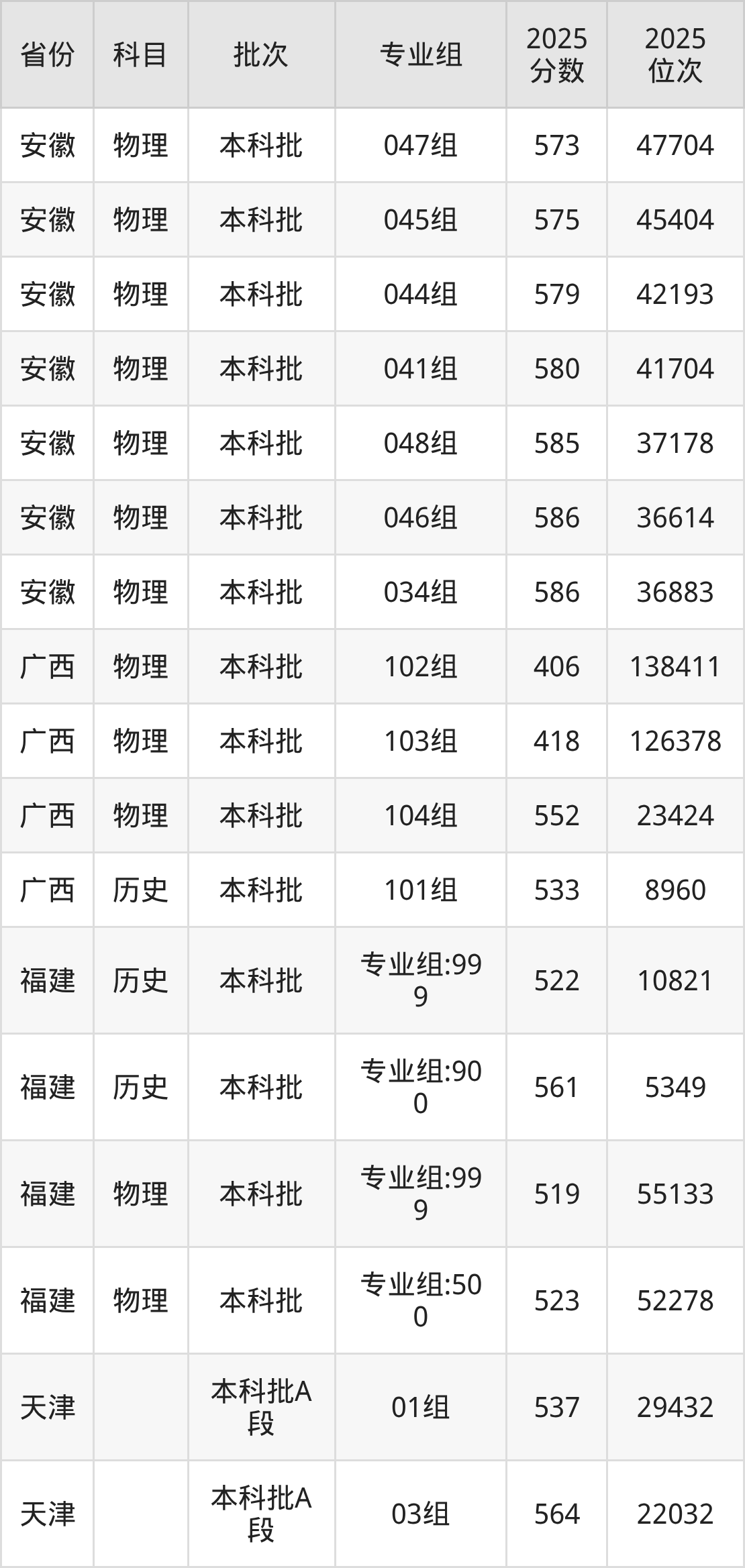 2025年在本科物理类进行招生,各专业组分数线详情如下: