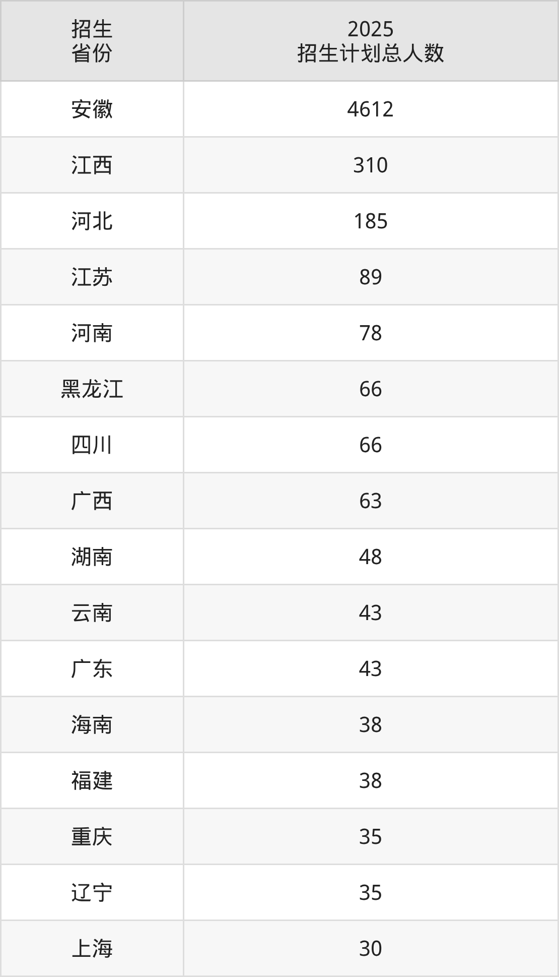 2025年安徽师范大学面向全国21个省市开展本科招生;招生专业共60个,招生人数共5854人。2025年在安徽省招生计划总人数是4612人,其中,安徽师范大学在安徽省招生人数最多的是数学与应用数学。安徽师范大学在各省具体招生人数情况如下表。