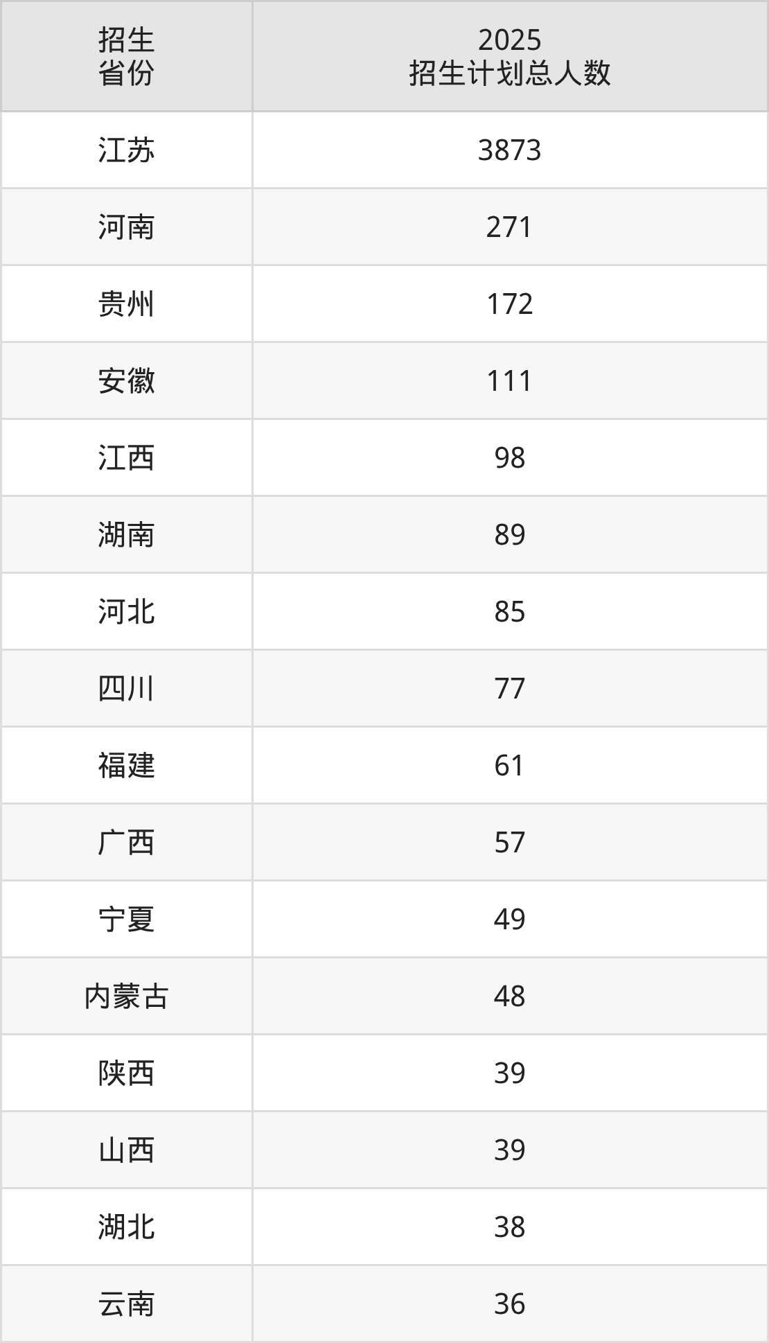 2025年南京工程学院面向全国26个省市开展本科招生;招生专业共48个,招生人数共5354人。2025年在江苏省招生计划总人数是3873人,其中,南京工程学院在江苏省招生人数最多的是机械类。南京工程学院在各省具体招生人数情况如下表。
