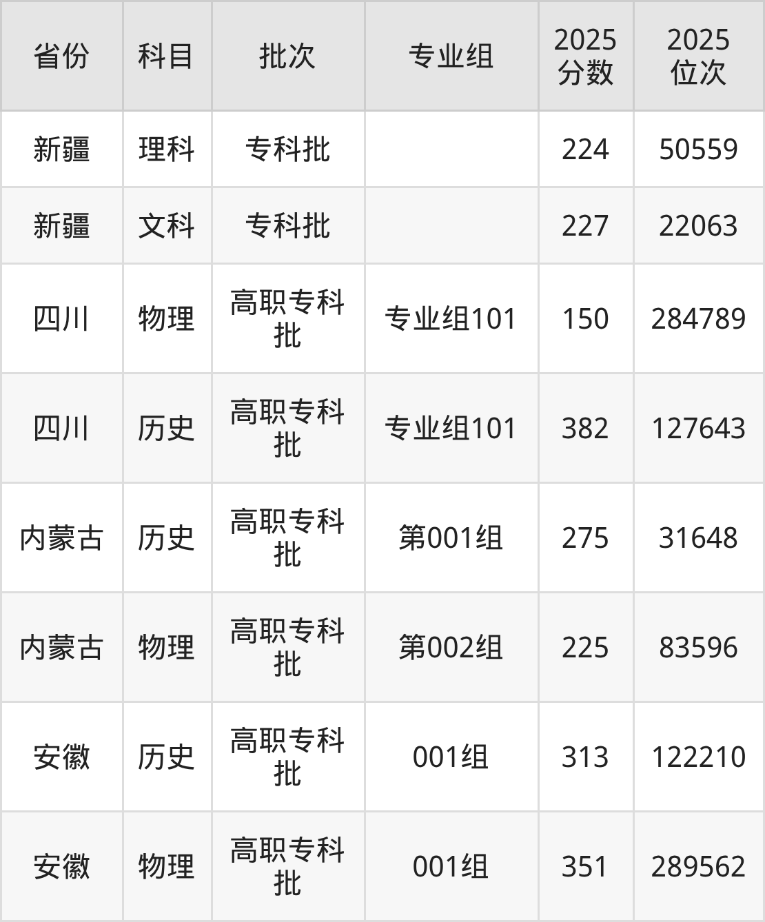 2025年铜川职业技术学院全国录取分数线是150分到432分,录取最低在四川物理类(专业组101)、录取最高在河北历史类。各省各专业组最低分具有差异,详情如下:
