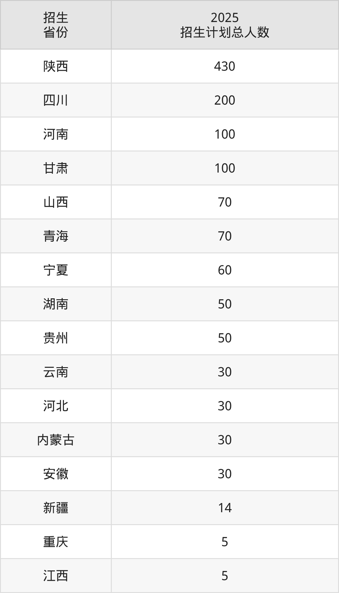 2025年铜川职业技术学院面向全国16个省市开展专科招生;招生专业共26个,招生人数共1274人。2025年在陕西省招生计划总人数是430人,其中,铜川职业技术学院在陕西省招生人数最多的是新能源材料应用技术。铜川职业技术学院在各省具体招生人数情况如下表。