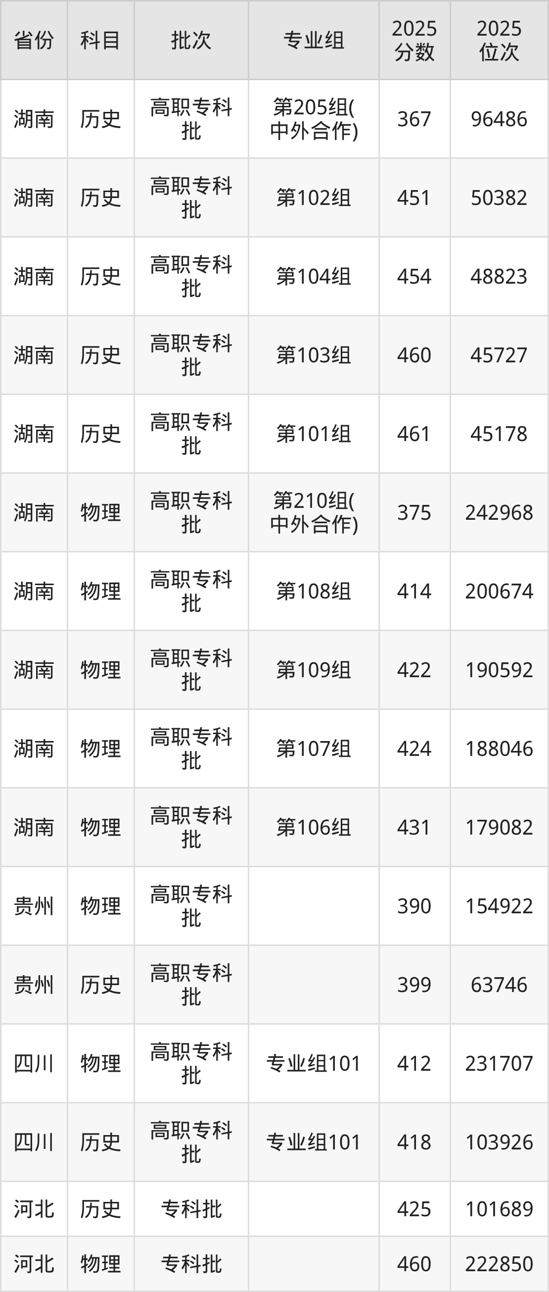 湖南工业职业技术学院专业组101:2025年投档录取最低分为418分,录取最低位次为103926名。