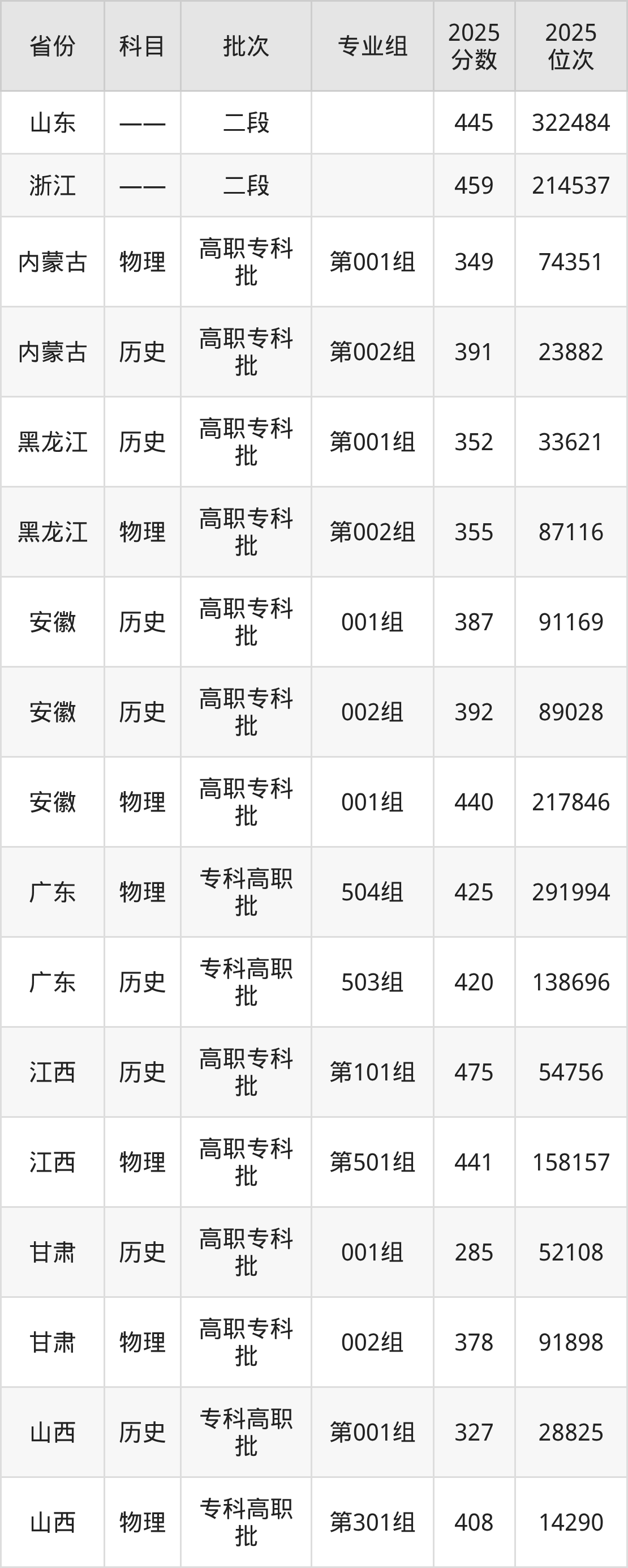 湖南工业职业技术学院第001组:2025年投档录取最低分为349分,录取最低位次为74351名。