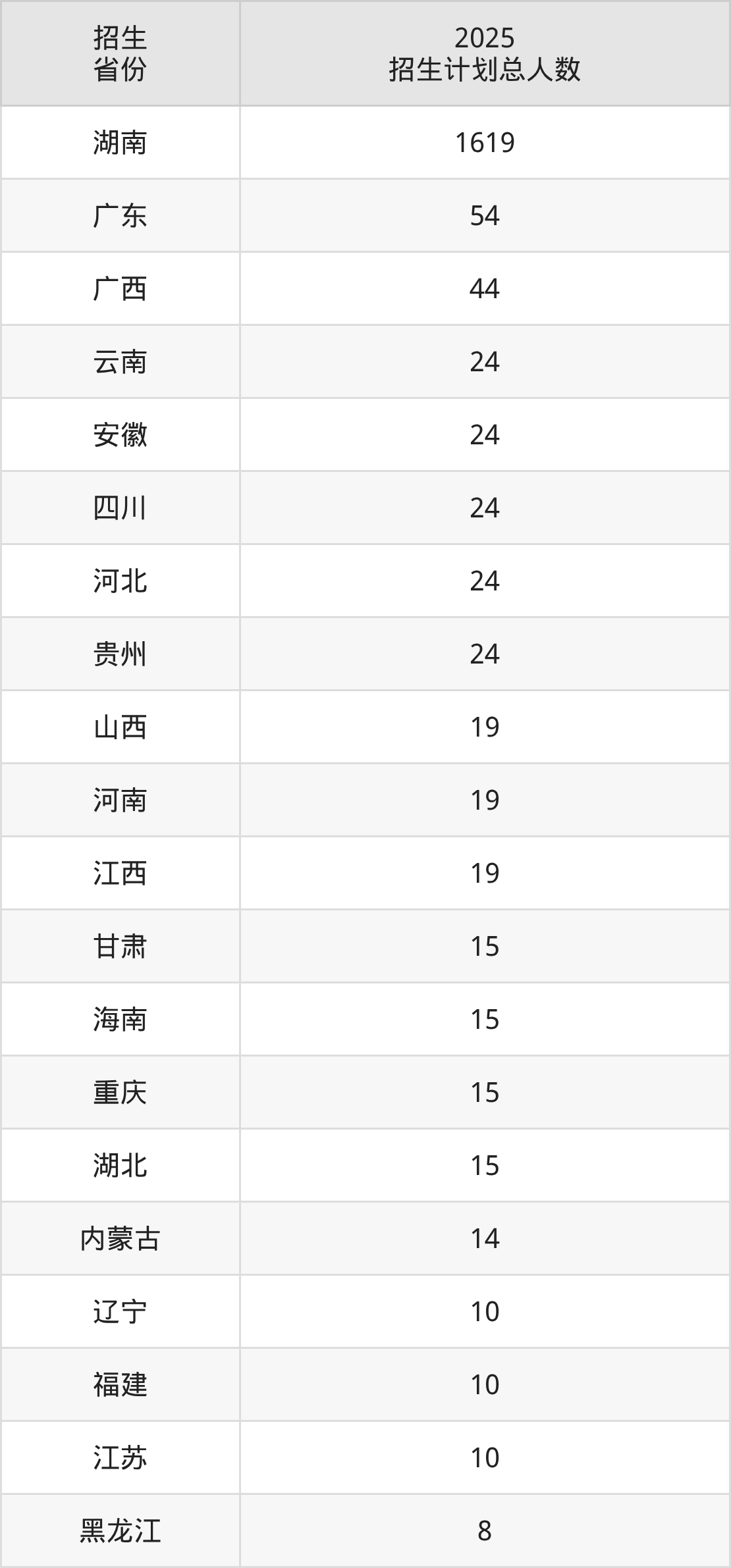 2025年湖南工业职业技术学院面向全国25个省市开展专科招生;招生专业共37个,招生人数共2032人。2025年在湖南省招生计划总人数是1619人,其中,湖南工业职业技术学院在湖南省招生人数最多的是电气自动化技术。湖南工业职业技术学院在各省具体招生人数情况如下表。