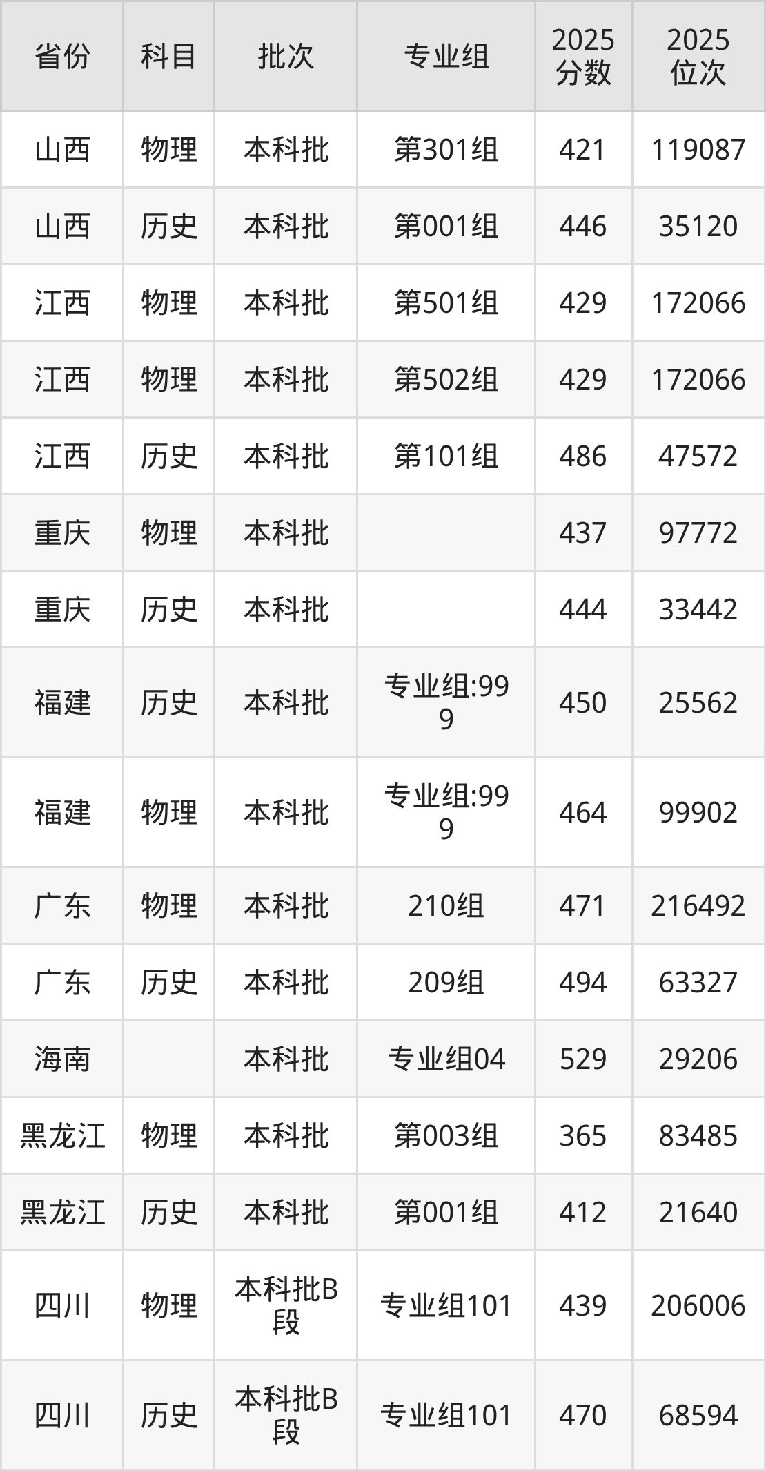 南昌职业大学2025招生录取分数线已公布,2025年南昌职业大学在江西省本科物理类投档录取最低分429分,本科历史类投档录取最低分486分。在四川省本科历史类投档录取最低分470分,更多省份具体录取分数线详见下文。