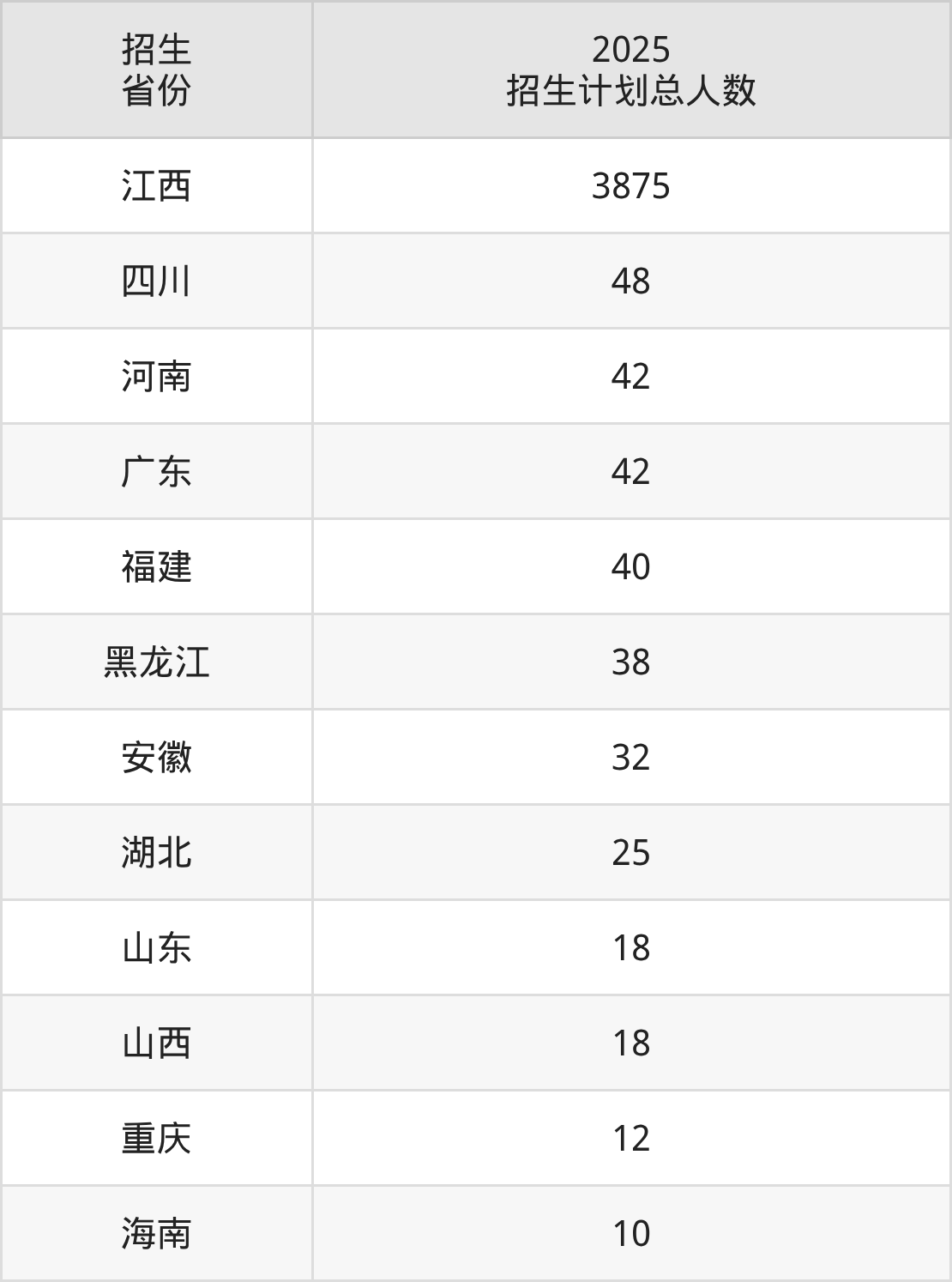 2025年南昌职业大学面向全国12个省市开展本科招生;招生专业共24个,招生人数共4200人。2025年在江西省招生计划总人数是3875人,其中,南昌职业大学在江西省招生人数最多的是软件工程技术。南昌职业大学在各省具体招生人数情况如下表。