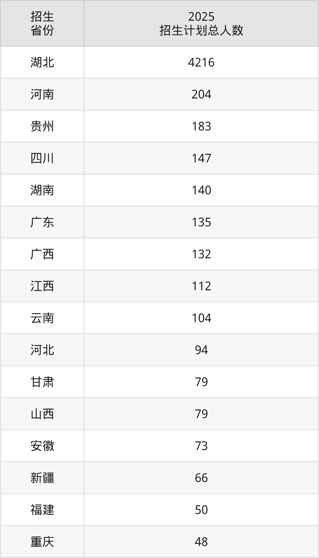 2025年武汉科技大学面向全国28个省市开展本科招生;招生专业共50个,招生人数共6138人。2025年在湖北省招生计划总人数是4216人,其中,武汉科技大学在湖北省招生人数最多的是机械类。武汉科技大学在各省具体招生人数情况如下表。