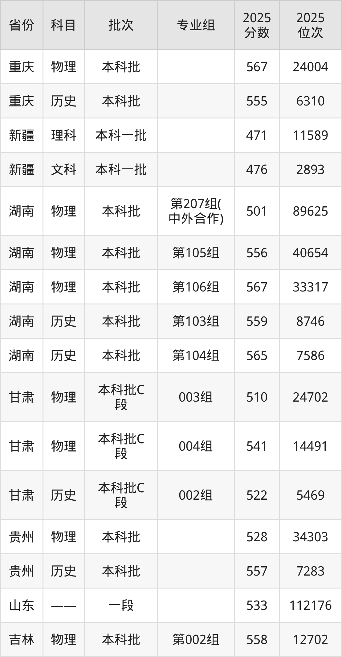 普通类本科物理类最低541分,本科历史类最低557分