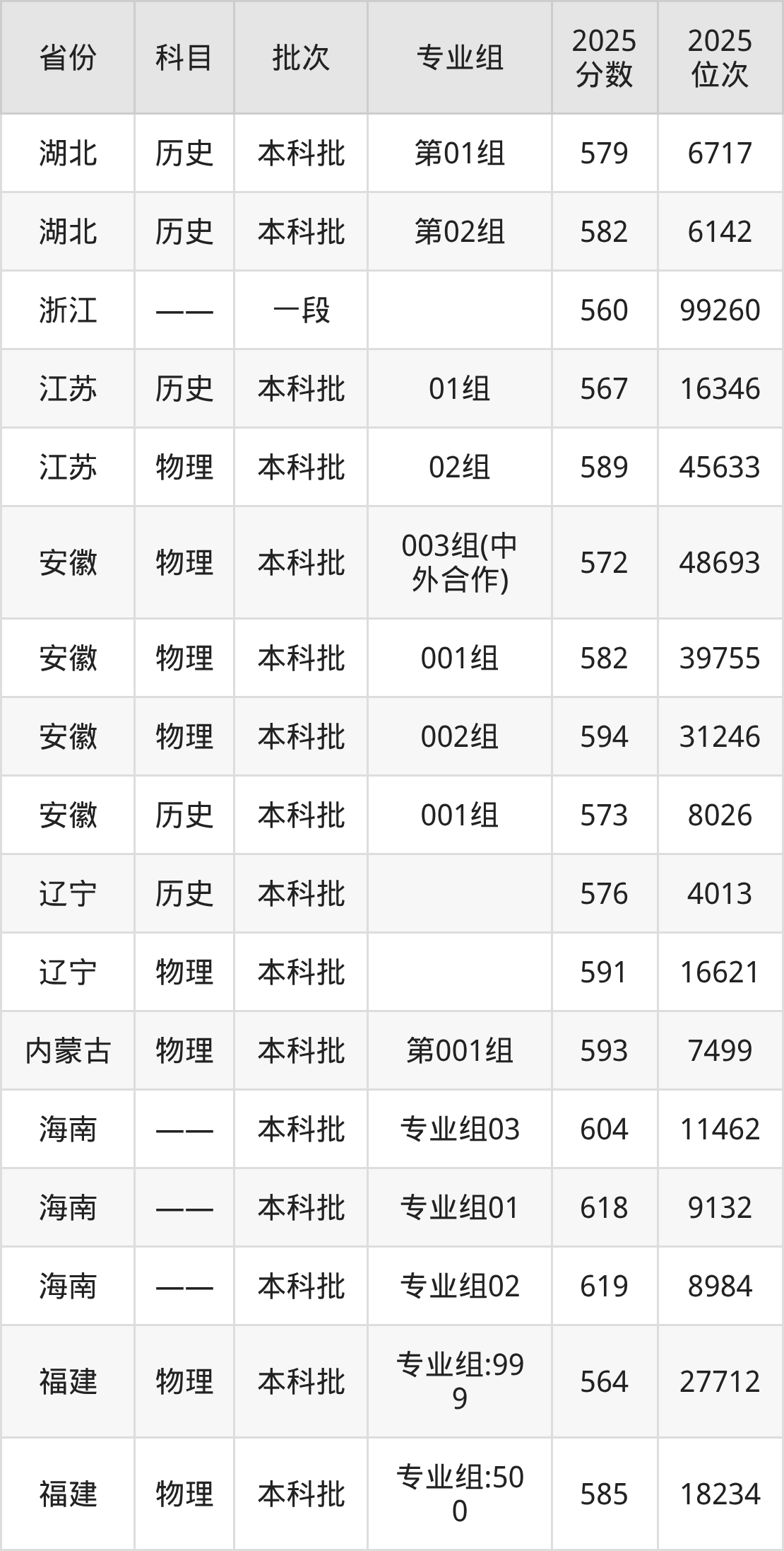 普通类本科物理类最低562分,本科历史类最低573分