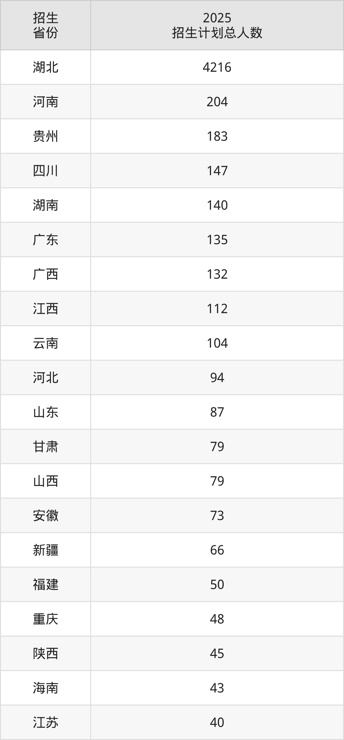 2025年武汉科技大学面向全国29个省市开展本科招生;招生专业共50个,招生人数共6225人。2025年在湖北省招生计划总人数是4216人,其中,武汉科技大学在湖北省招生人数最多的是机械类。武汉科技大学在各省具体招生人数情况如下表。