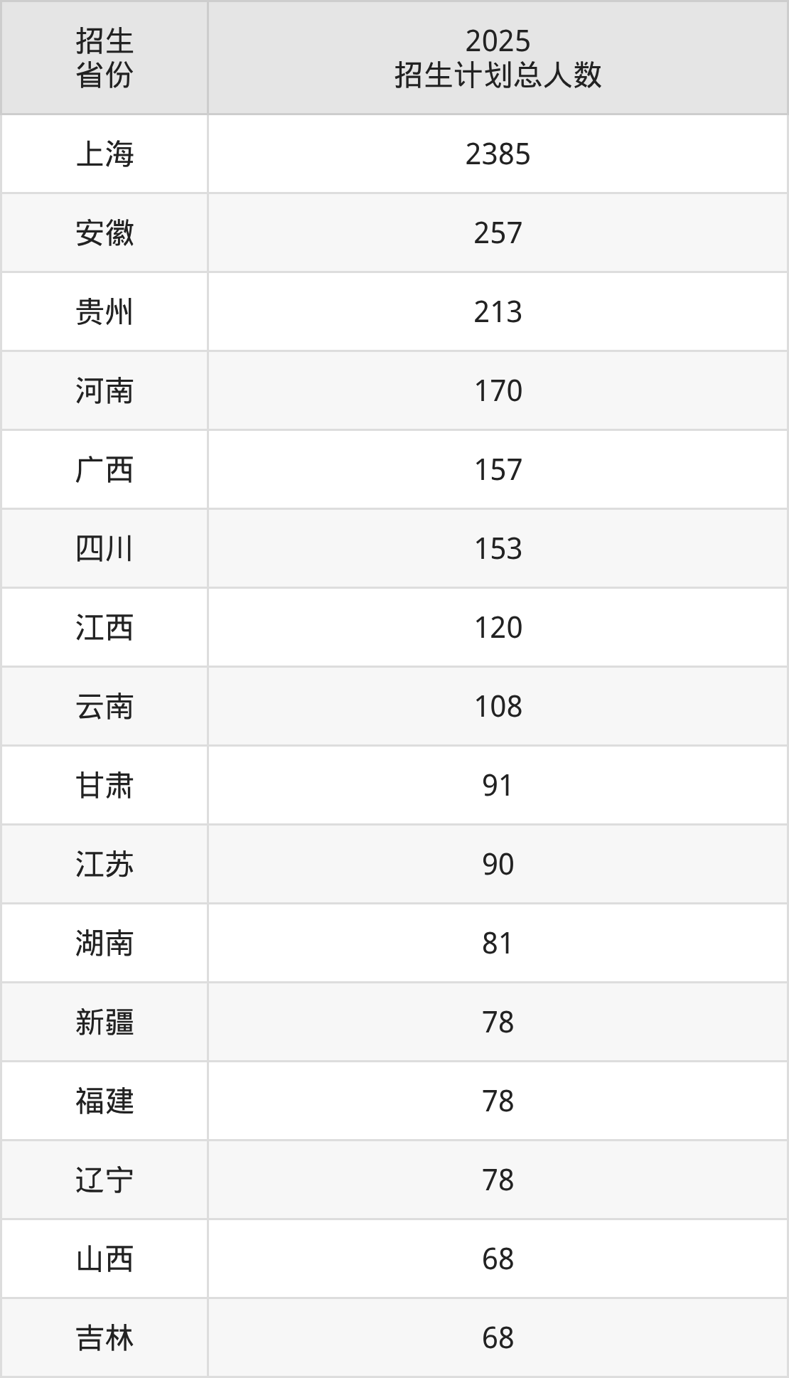 2025年上海立信会计金融学院面向全国28个省市开展本科招生;招生专业共36个,招生人数共4666人。2025年在上海市招生计划总人数是2385人,其中,上海立信会计金融学院在上海市招生人数最多的是金融学。上海立信会计金融学院在各省具体招生人数情况如下表。