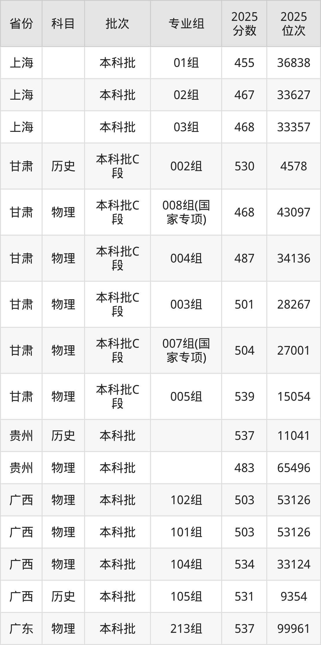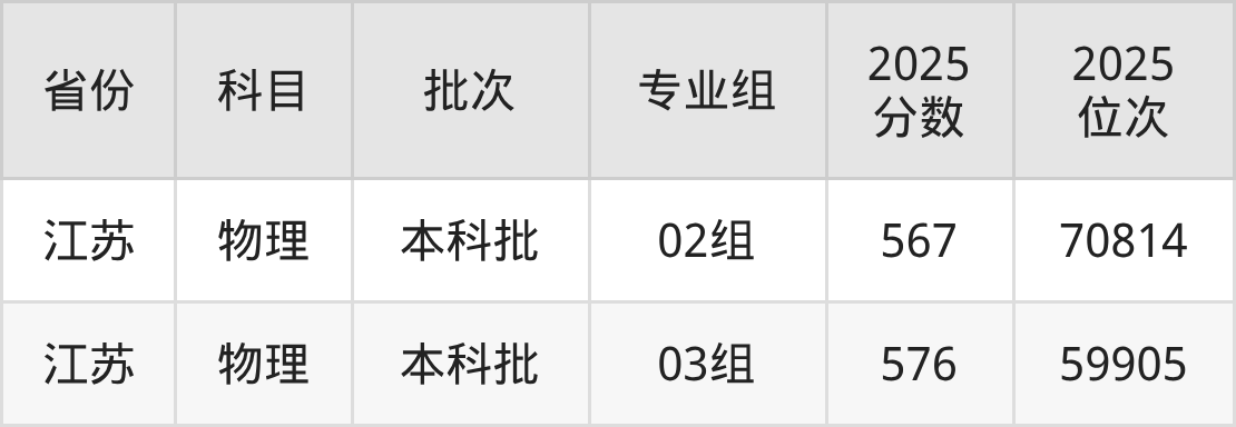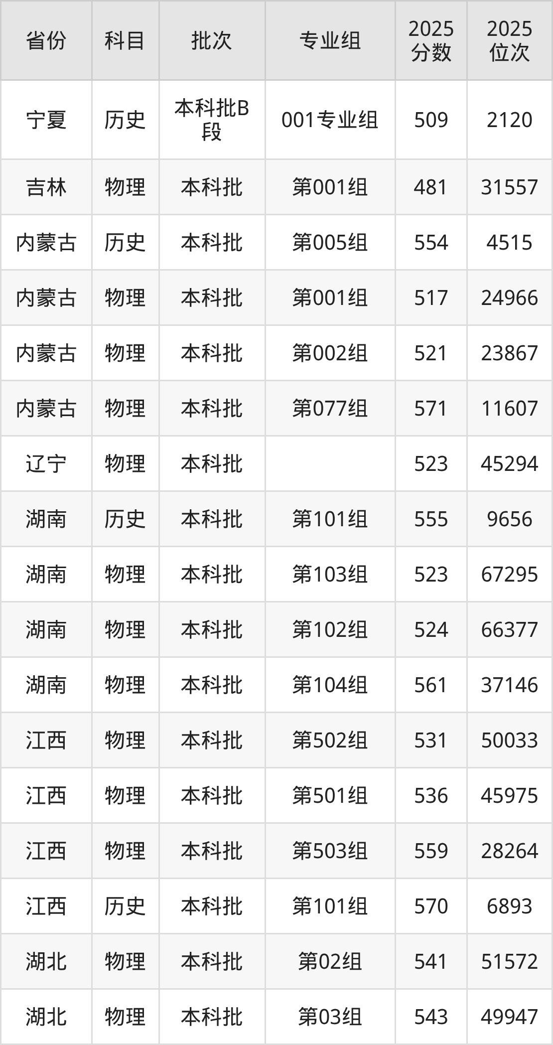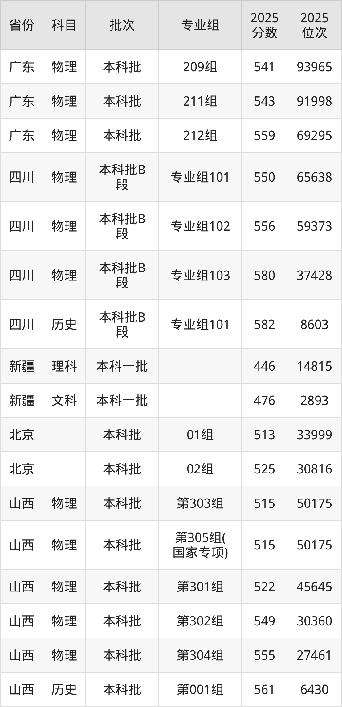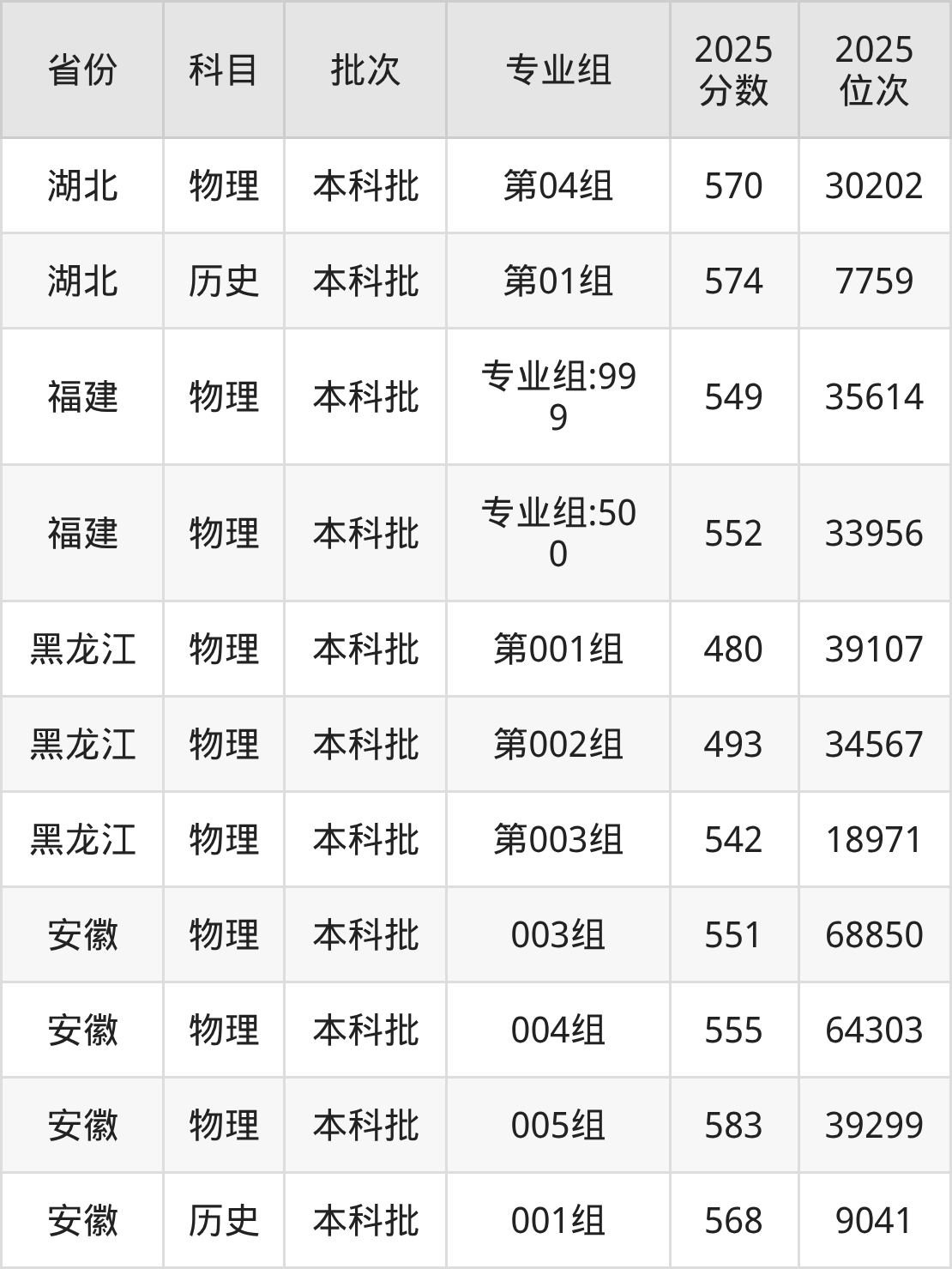 2025年在本科物理类进行招生,各专业组分数线详情如下: