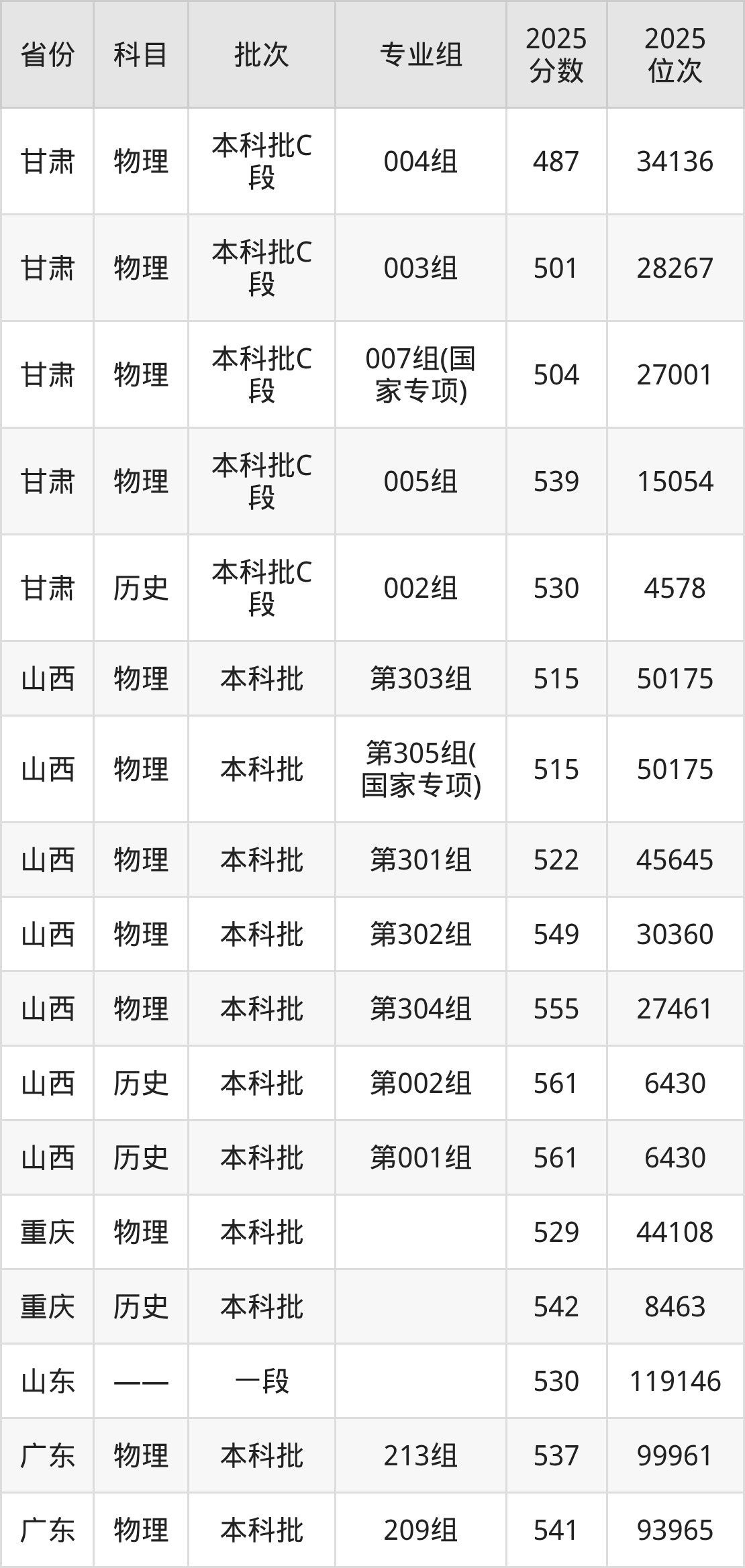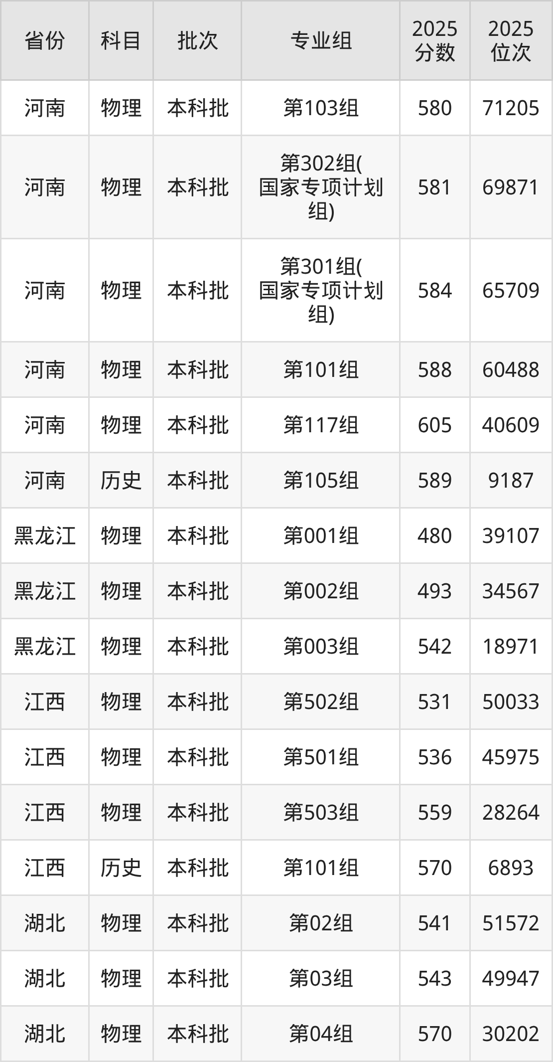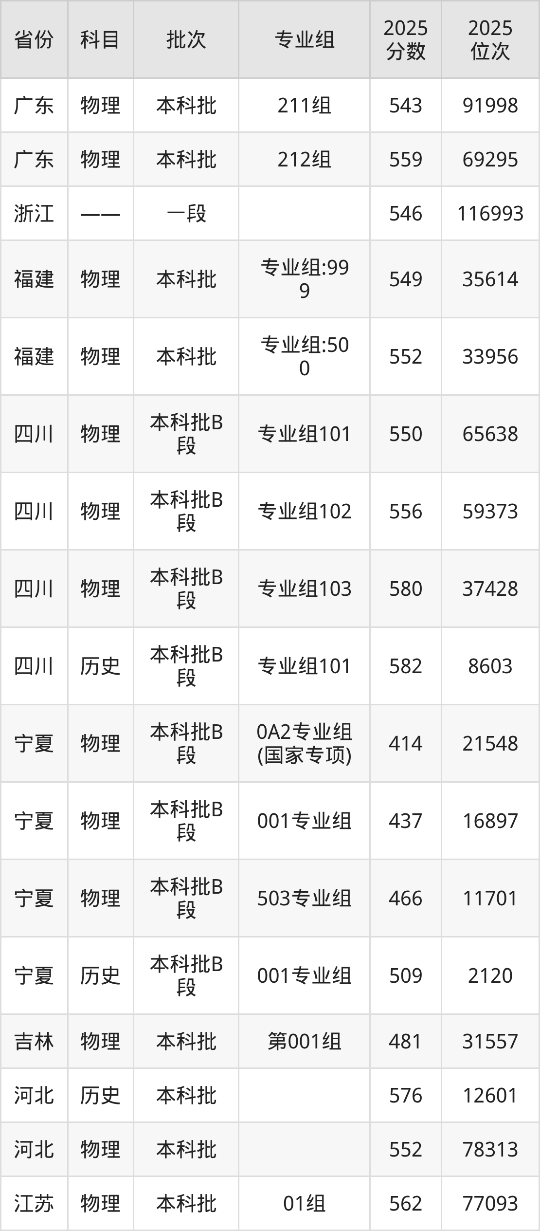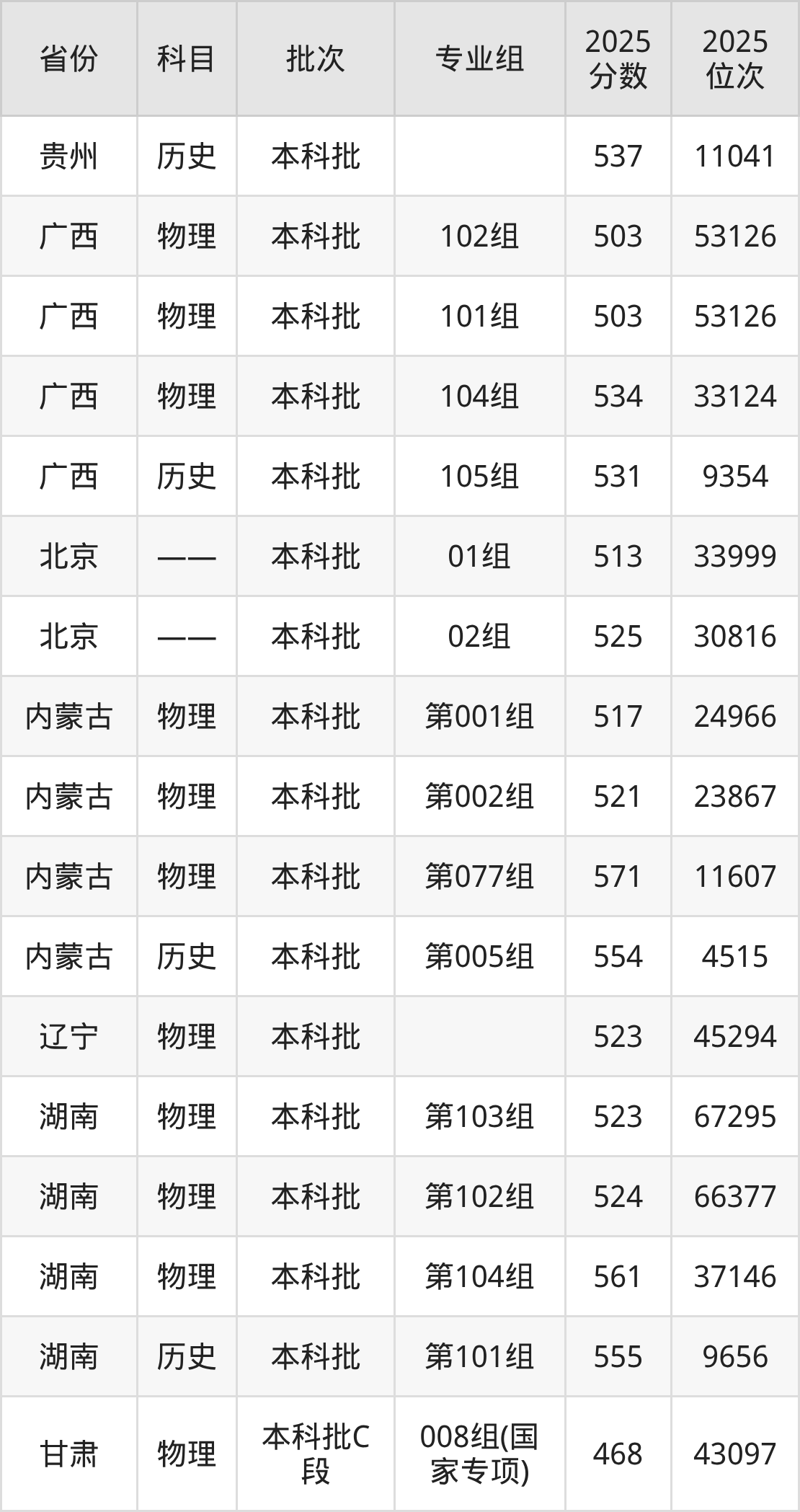 2025年在本科物理类进行招生,各专业组分数线详情如下: