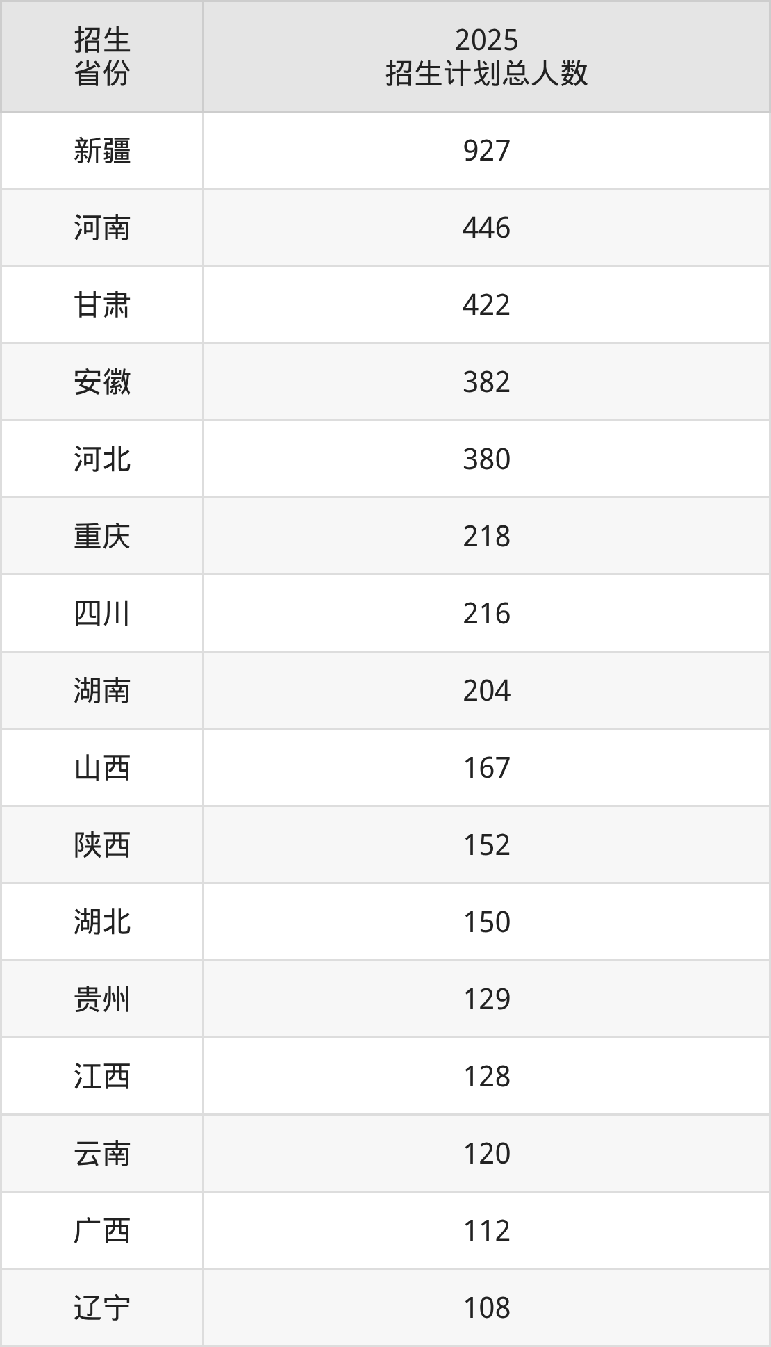 2025年石河子大学面向全国28个省市开展本科招生;招生专业共75个,招生人数共4752人。2025年在新疆维吾尔自治区招生计划总人数是927人,其中,石河子大学在新疆维吾尔自治区招生人数最多的是护理。石河子大学在各省具体招生人数情况如下表。