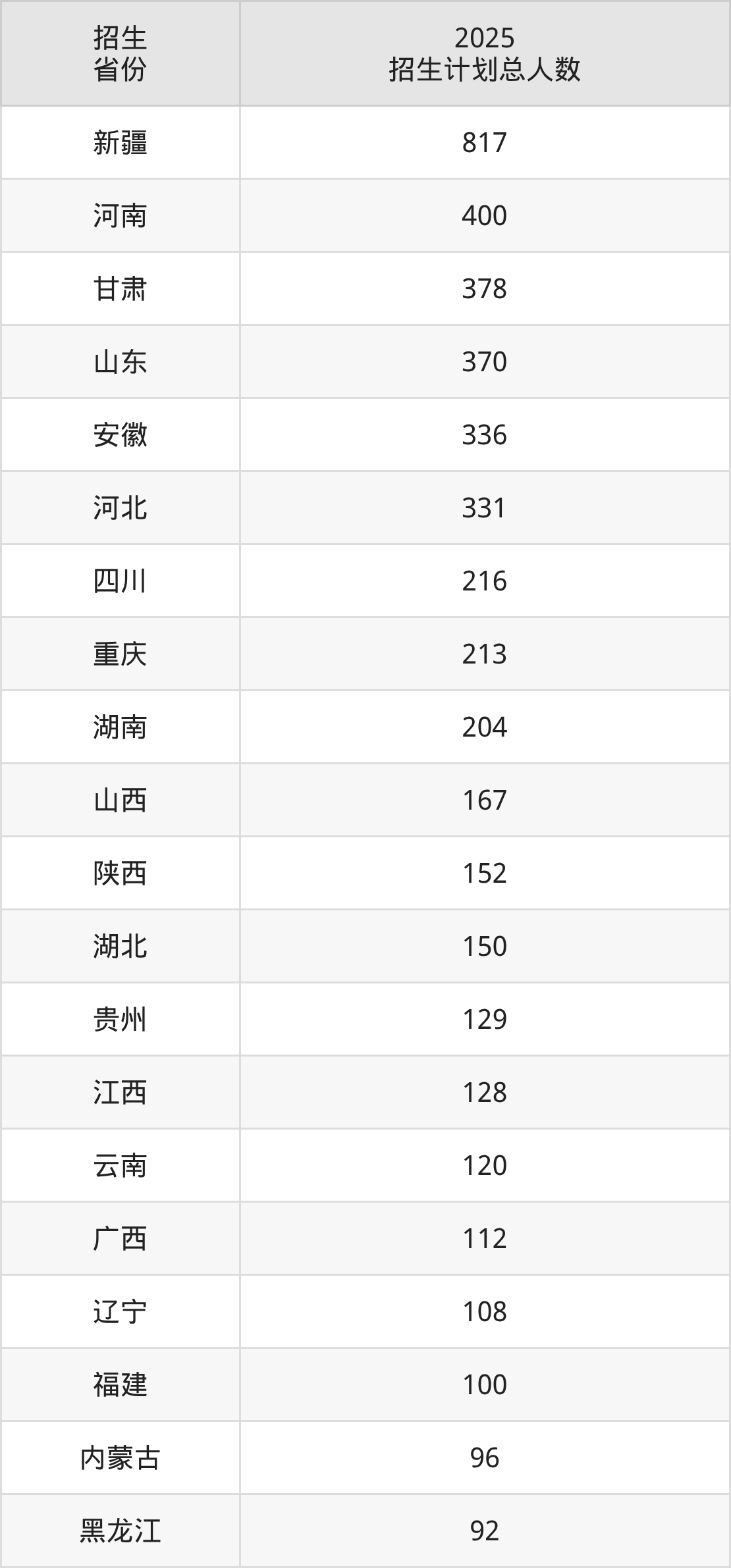 2025年石河子大学面向全国29个省市开展本科招生;招生专业共75个,招生人数共5112人。2025年在新疆维吾尔自治区招生计划总人数是817人,其中,石河子大学在新疆维吾尔自治区招生人数最多的是临床医学。石河子大学在各省具体招生人数情况如下表。