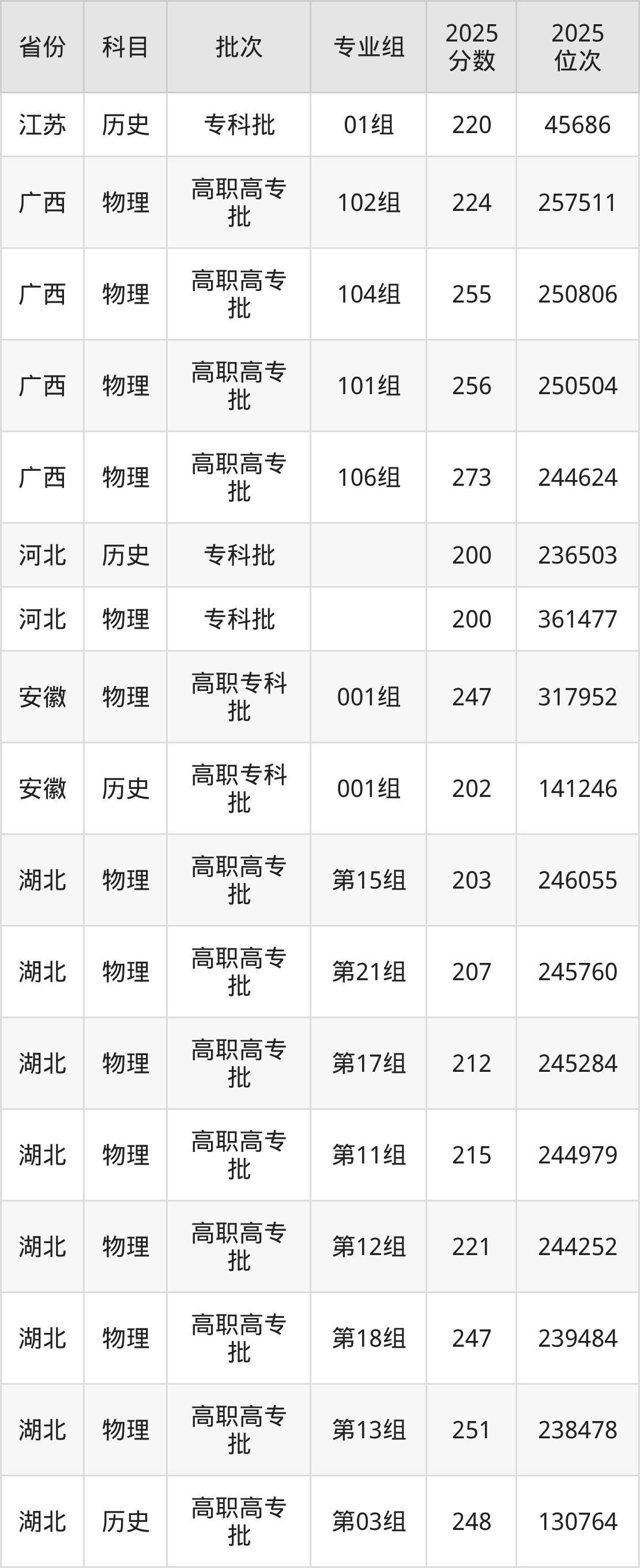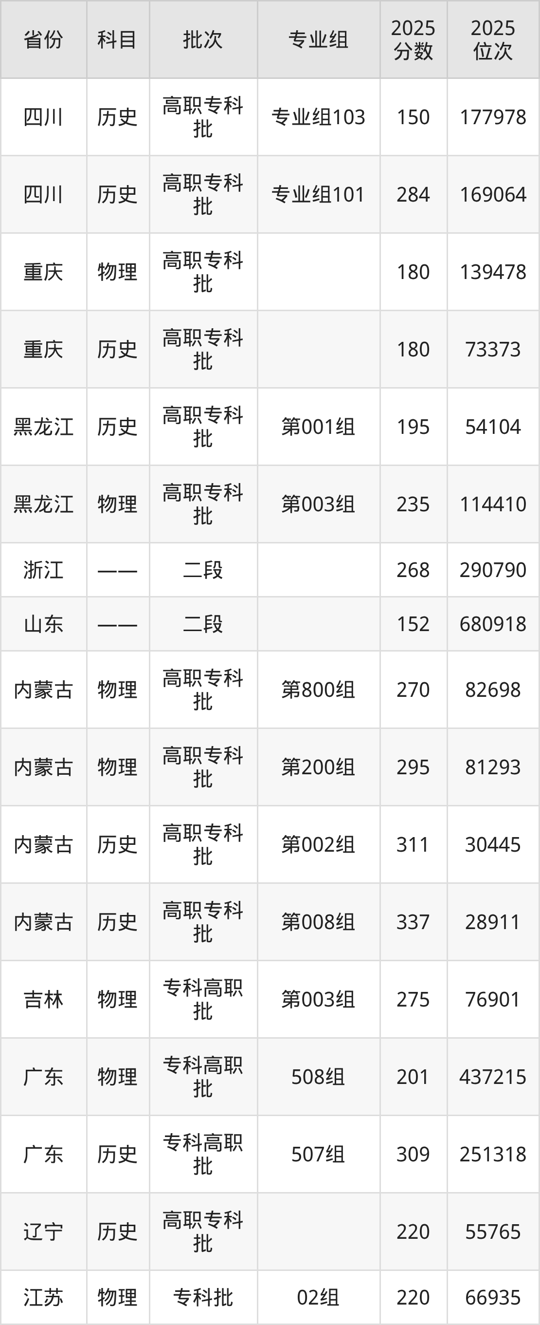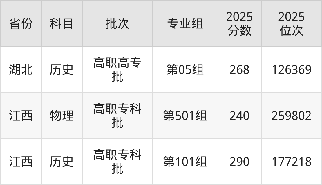 2025年在专科物理类进行招生,各专业组分数线详情如下: