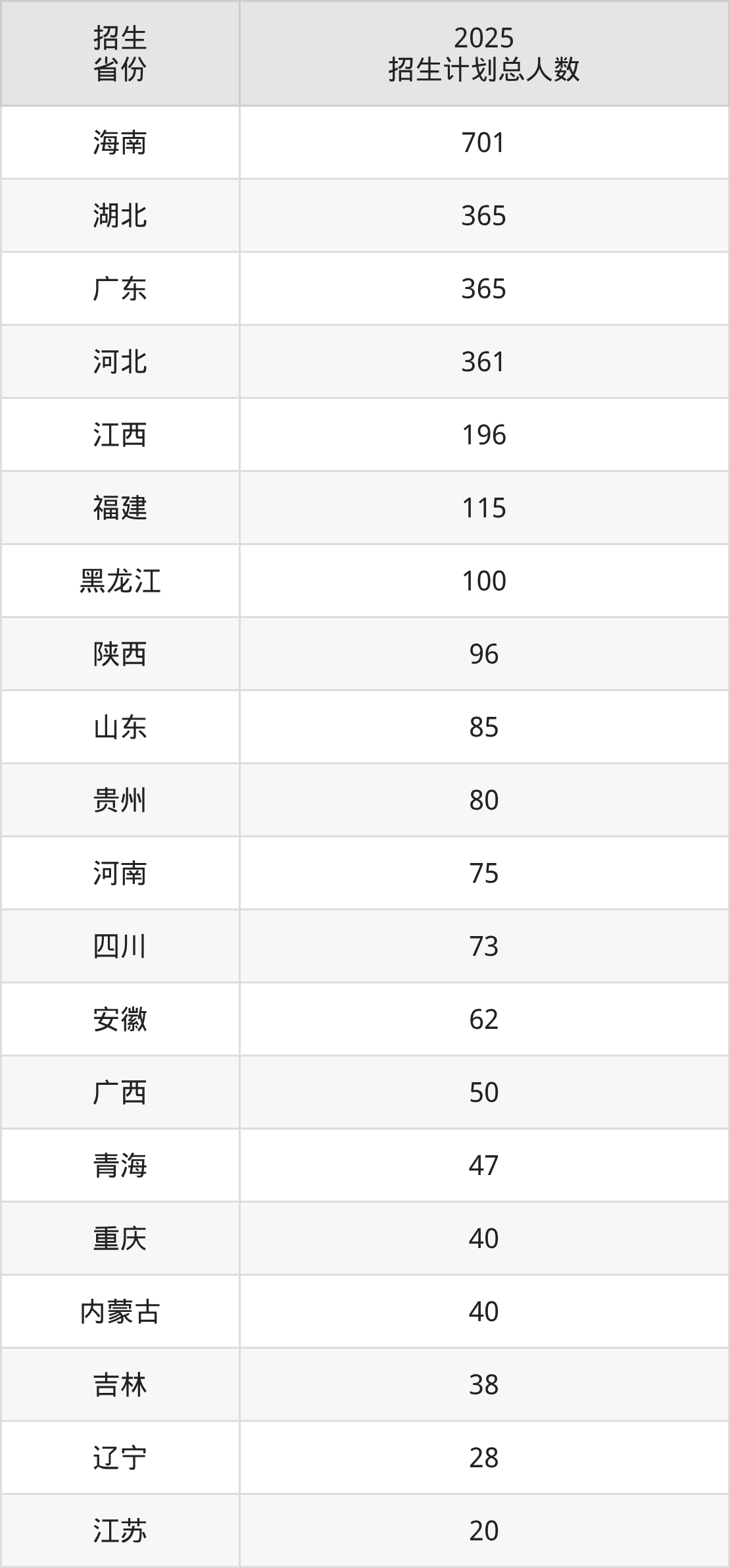 2025年海南东方新丝路职业学院面向全国21个省市开展专科招生;招生专业共13个,招生人数共2947人。2025年在海南省招生计划总人数是701人,其中,海南东方新丝路职业学院在海南省招生人数最多的是新能源材料应用技术。海南东方新丝路职业学院在各省具体招生人数情况如下表。