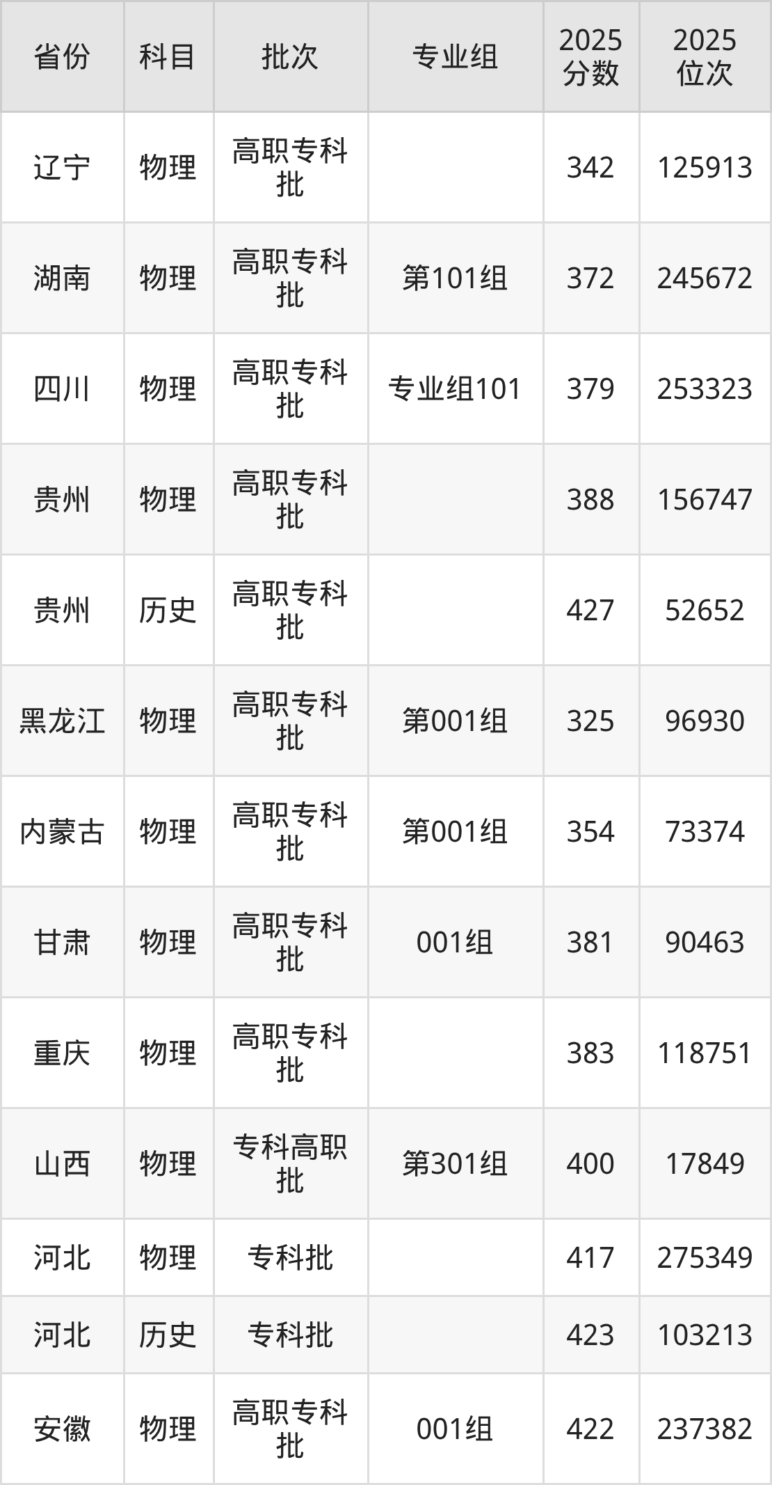 2025年在专科物理类进行招生,各专业组分数线详情如下:
