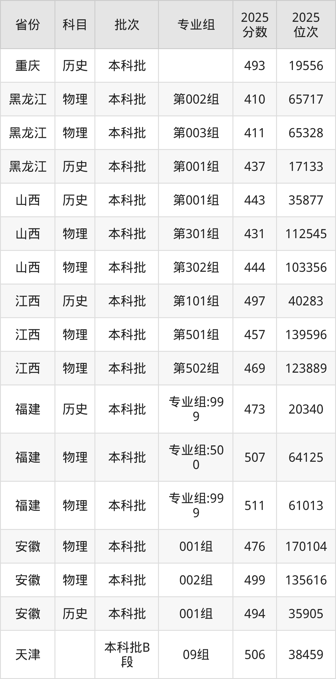 2025年在本科历史类进行招生,各专业组分数线详情如下: