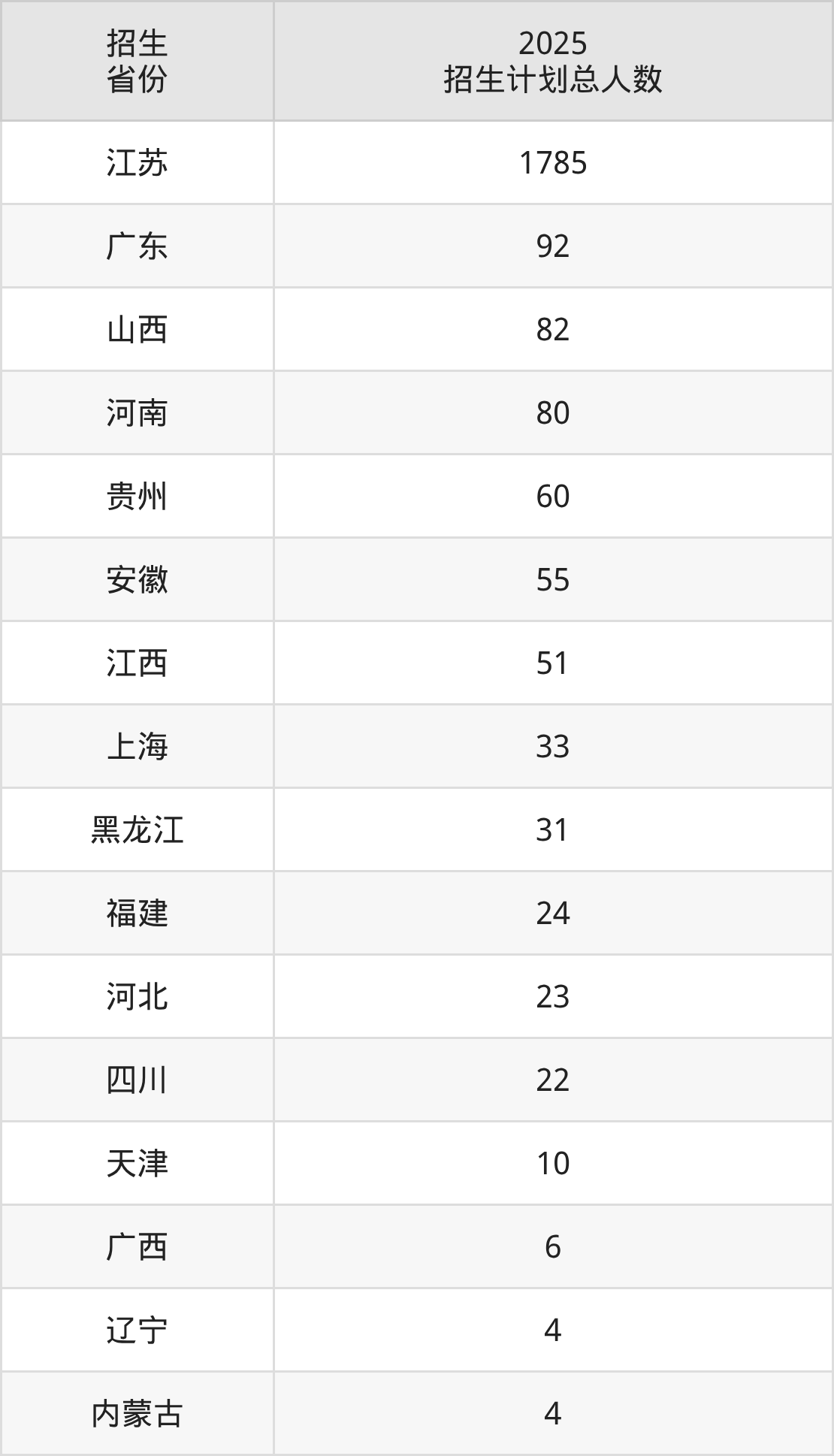 2025年南京传媒学院面向全国18个省市开展本科招生;招生专业共19个,招生人数共2367人。2025年在江苏省招生计划总人数是1785人,其中,南京传媒学院在江苏省招生人数最多的是广播电视编导。南京传媒学院在各省具体招生人数情况如下表。