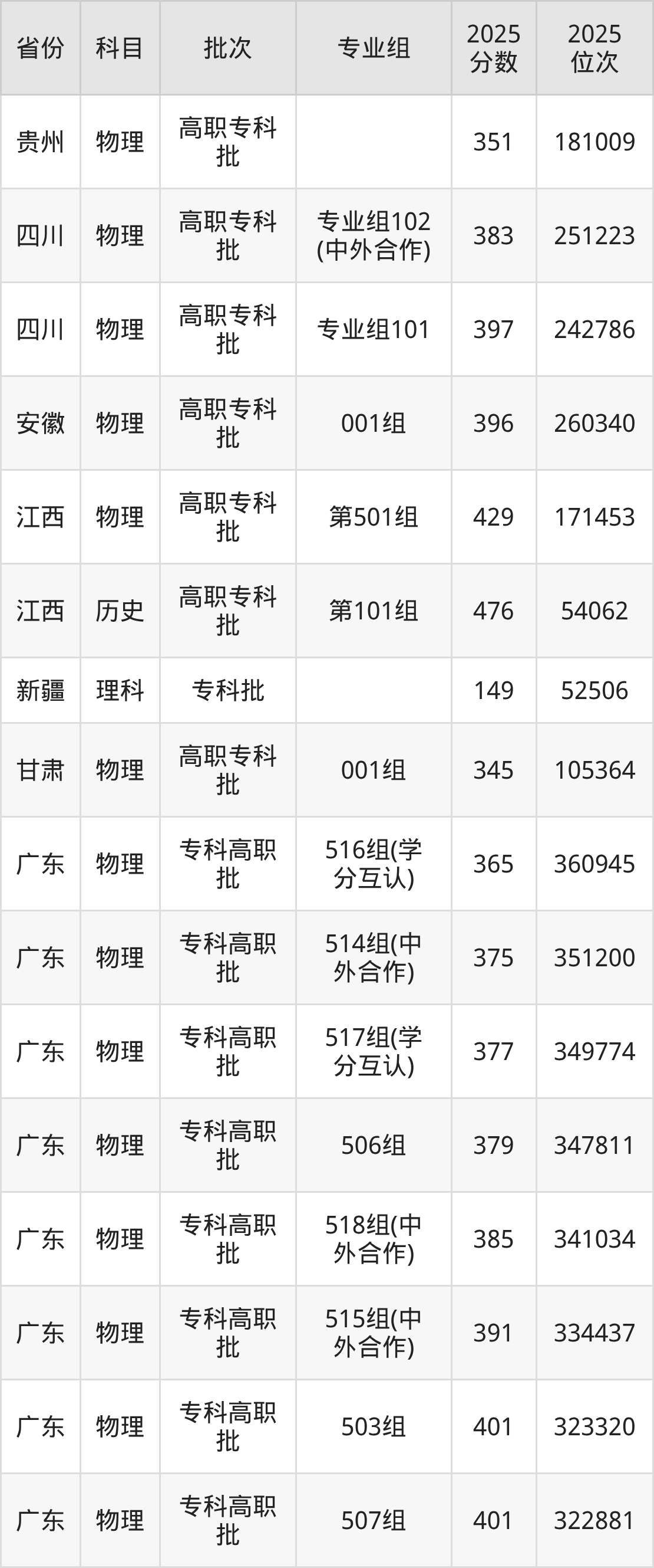 2025年在专科物理类进行招生,各专业组分数线详情如下: