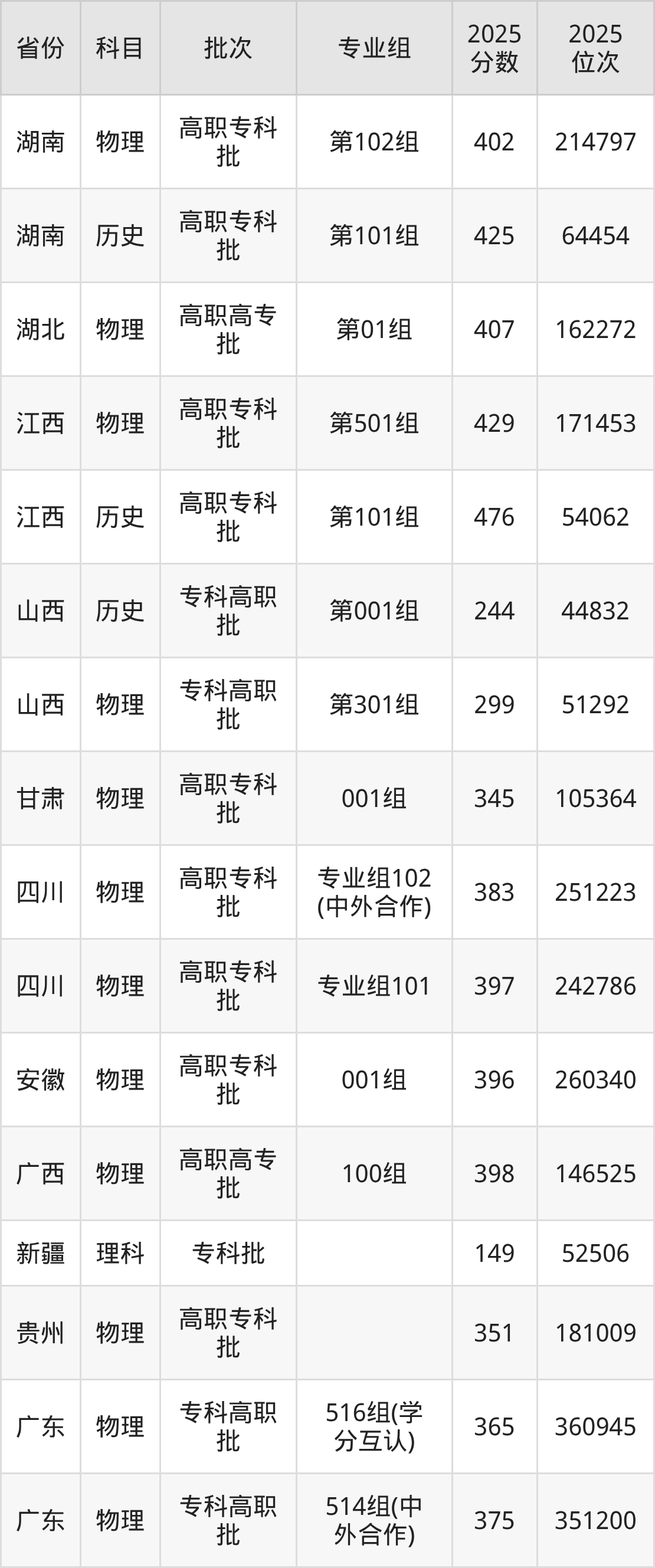 普通类专科物理类最低402分,专科历史类最低425分