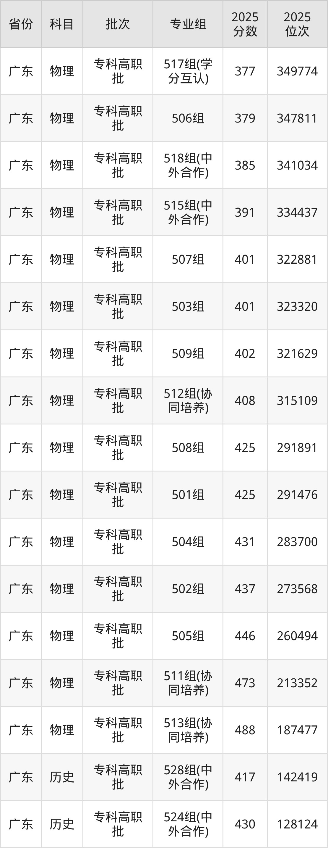 广东水利电力职业技术学院517组(学分互认):2025年投档录取最低分为377分,录取最低位次为349774名。