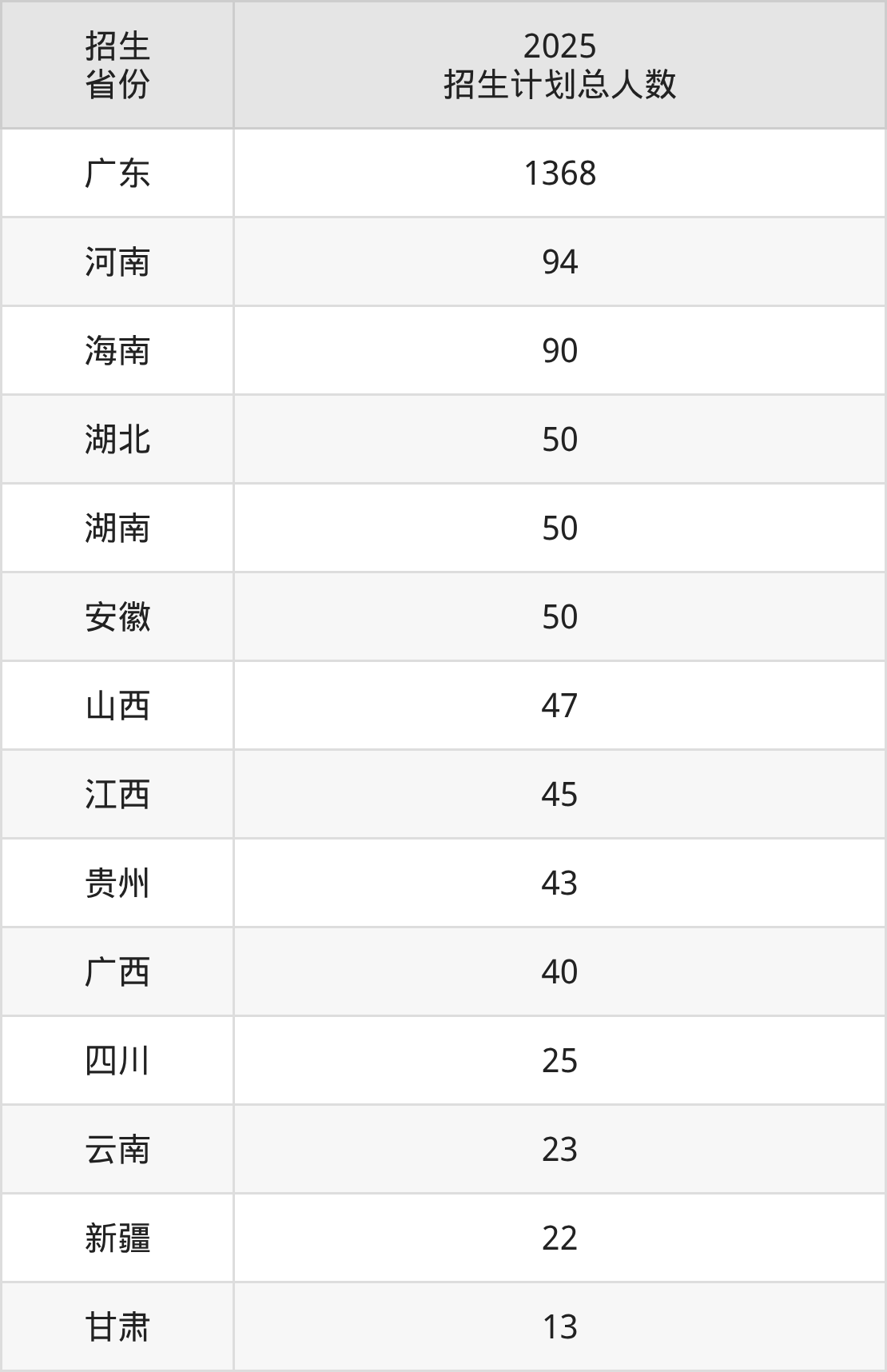 2025年广东水利电力职业技术学院面向全国14个省市开展专科招生;招生专业共46个,招生人数共1960人。2025年在广东省招生计划总人数是1368人,其中,广东水利电力职业技术学院在广东省招生人数最多的是机电一体化技术。广东水利电力职业技术学院在各省具体招生人数情况如下表。