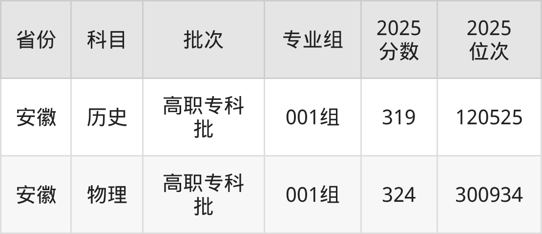 芜湖医药健康职业学院001组:2025年投档录取最低分为319分,录取最低位次为120525名。