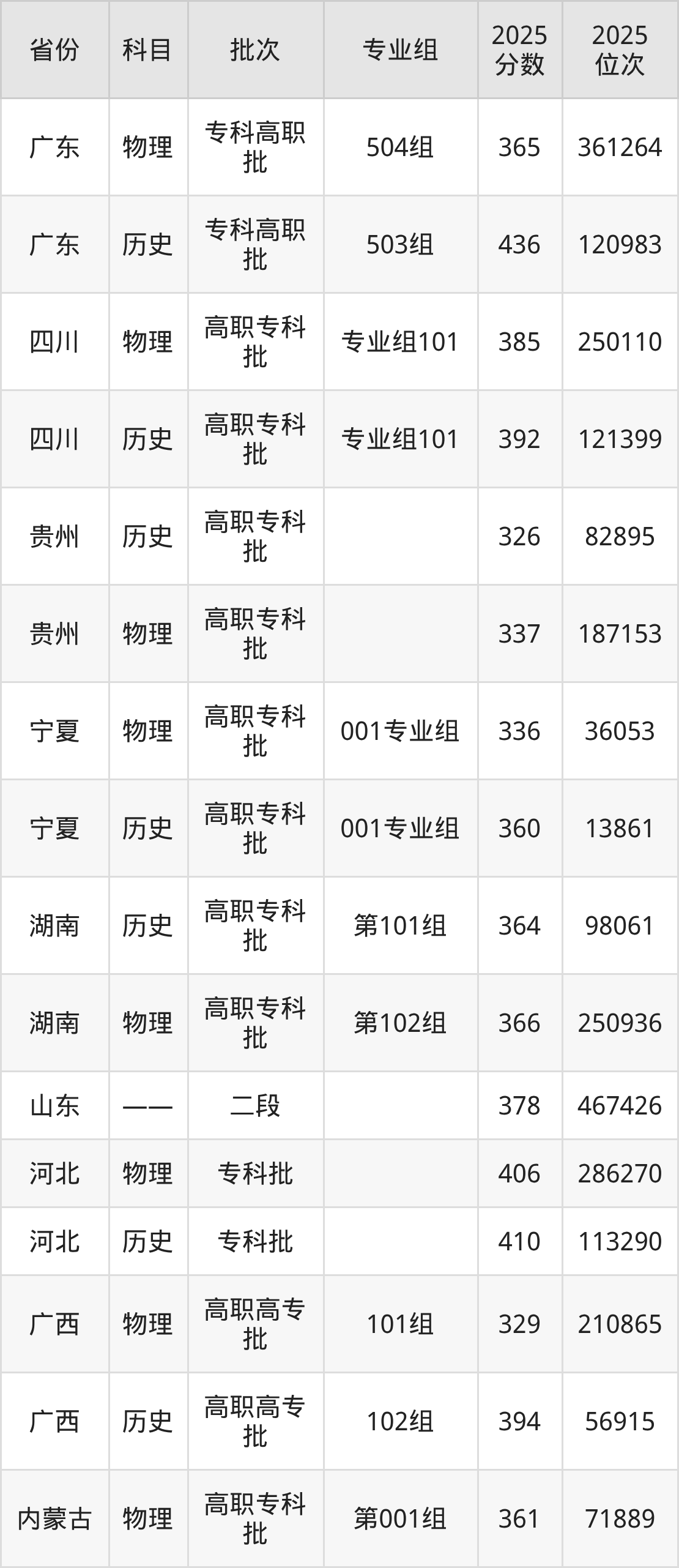普通类专科物理类最低361分,专科历史类最低439分