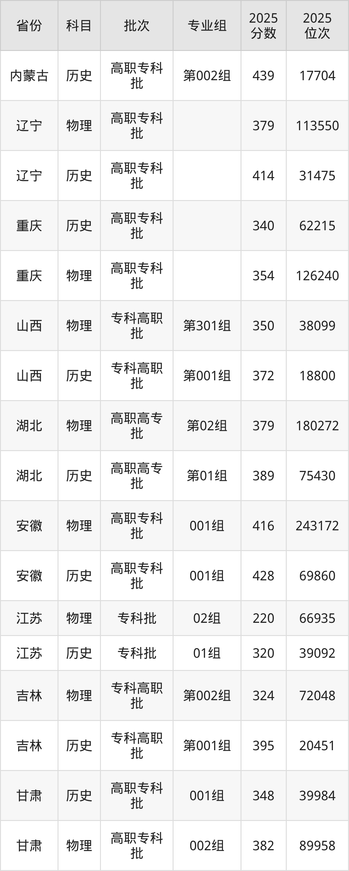 普通类专科物理类最低379分,专科历史类最低414分
