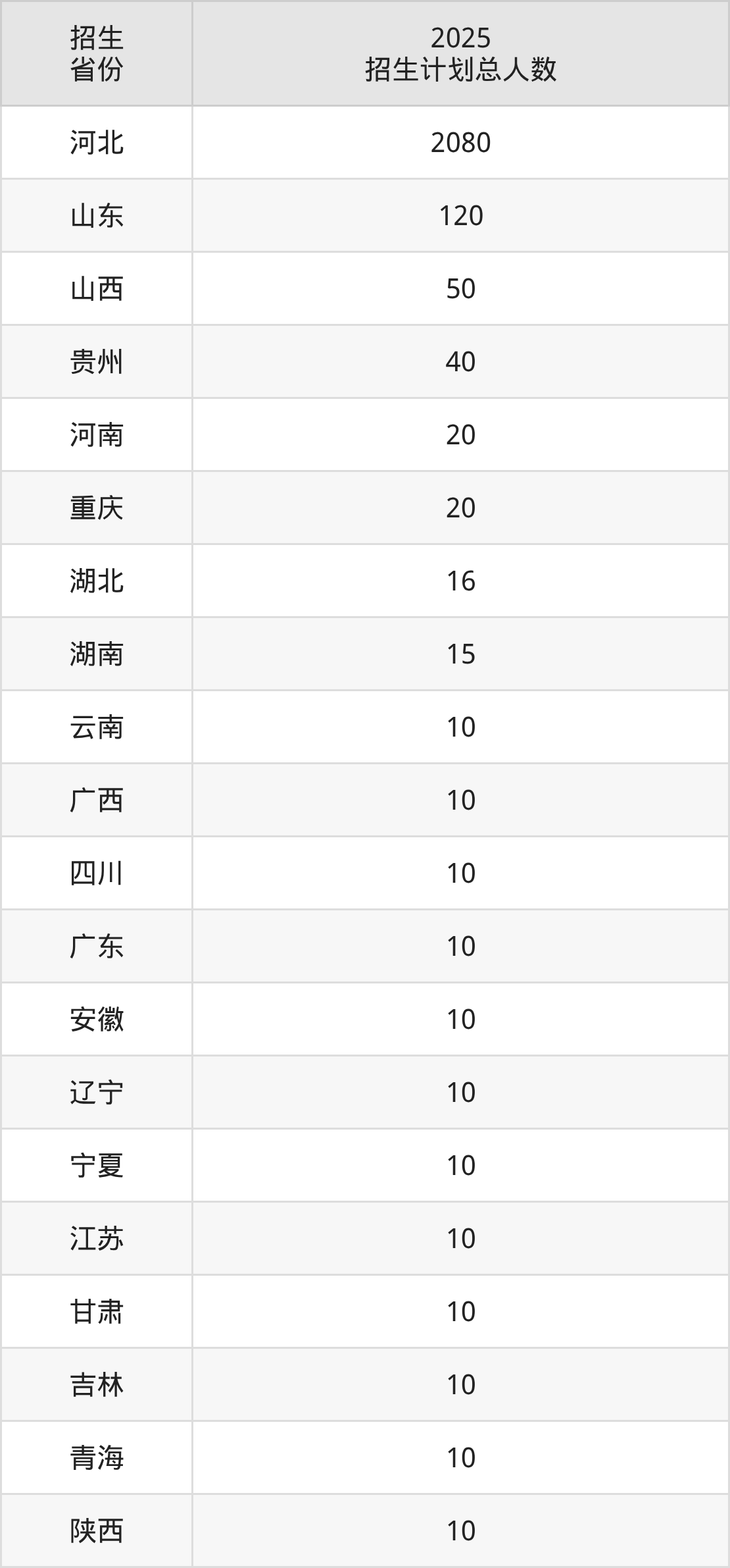 2025年河北化工医药职业技术学院面向全国22个省市开展专科招生;招生专业共43个,招生人数共2495人。2025年在河北省招生计划总人数是2080人,其中,河北化工医药职业技术学院在河北省招生人数最多的是机电一体化技术。河北化工医药职业技术学院在各省具体招生人数情况如下表。