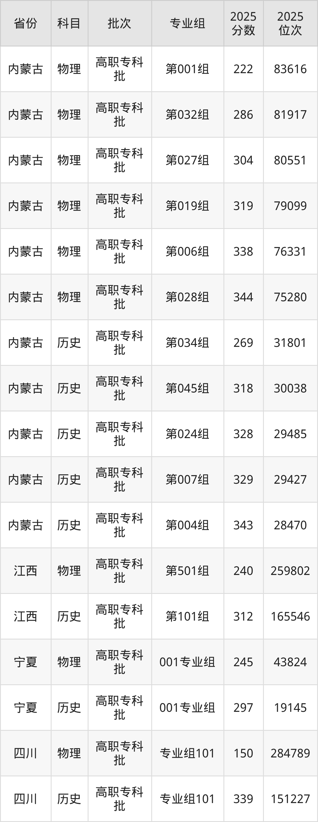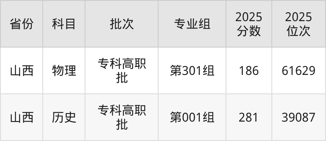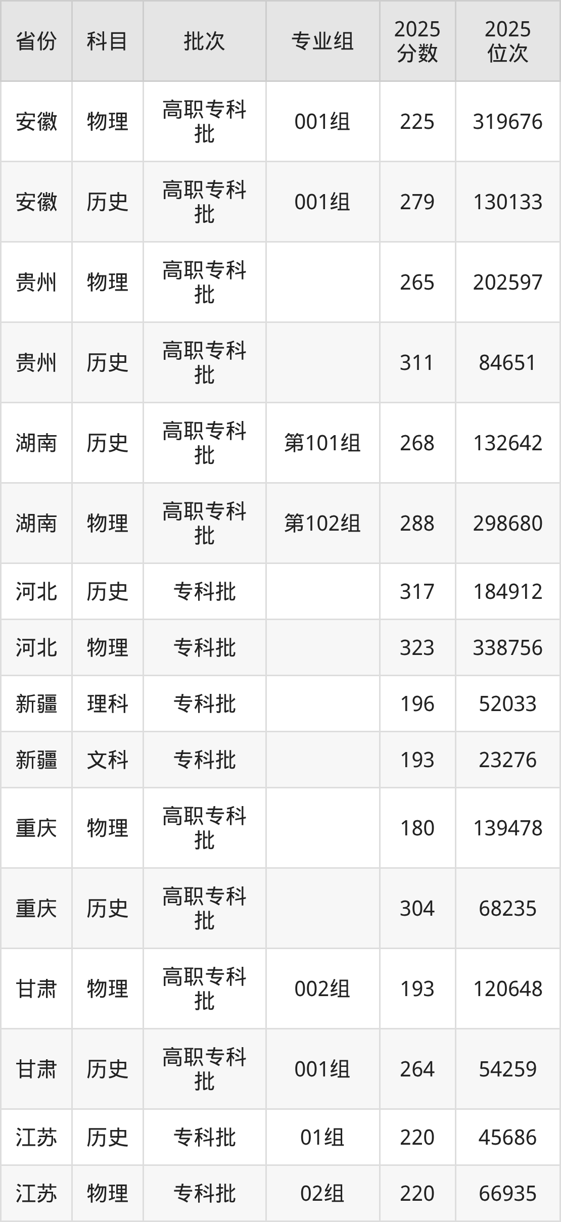普通类专科物理类最低186分,专科历史类最低281分
