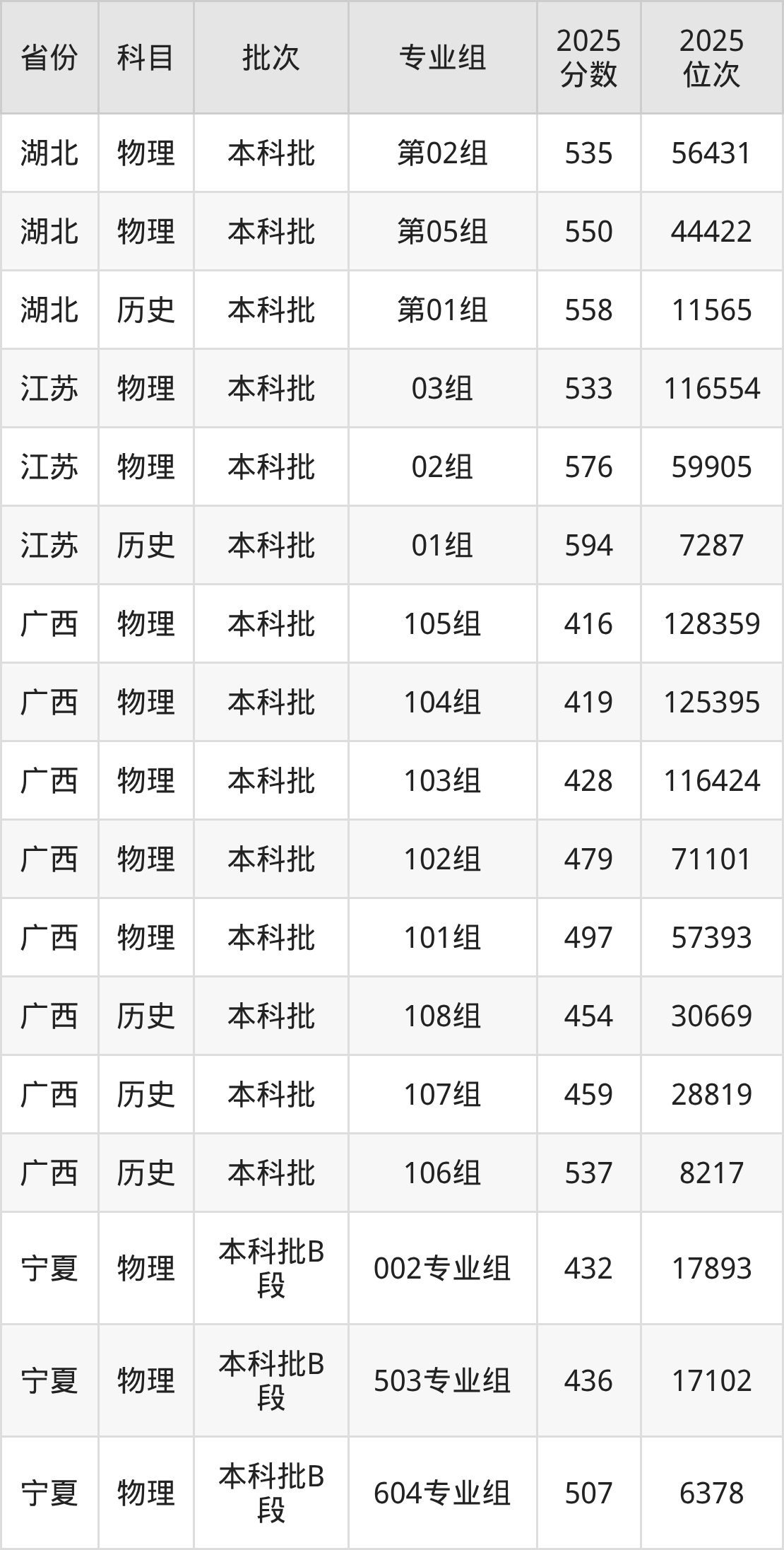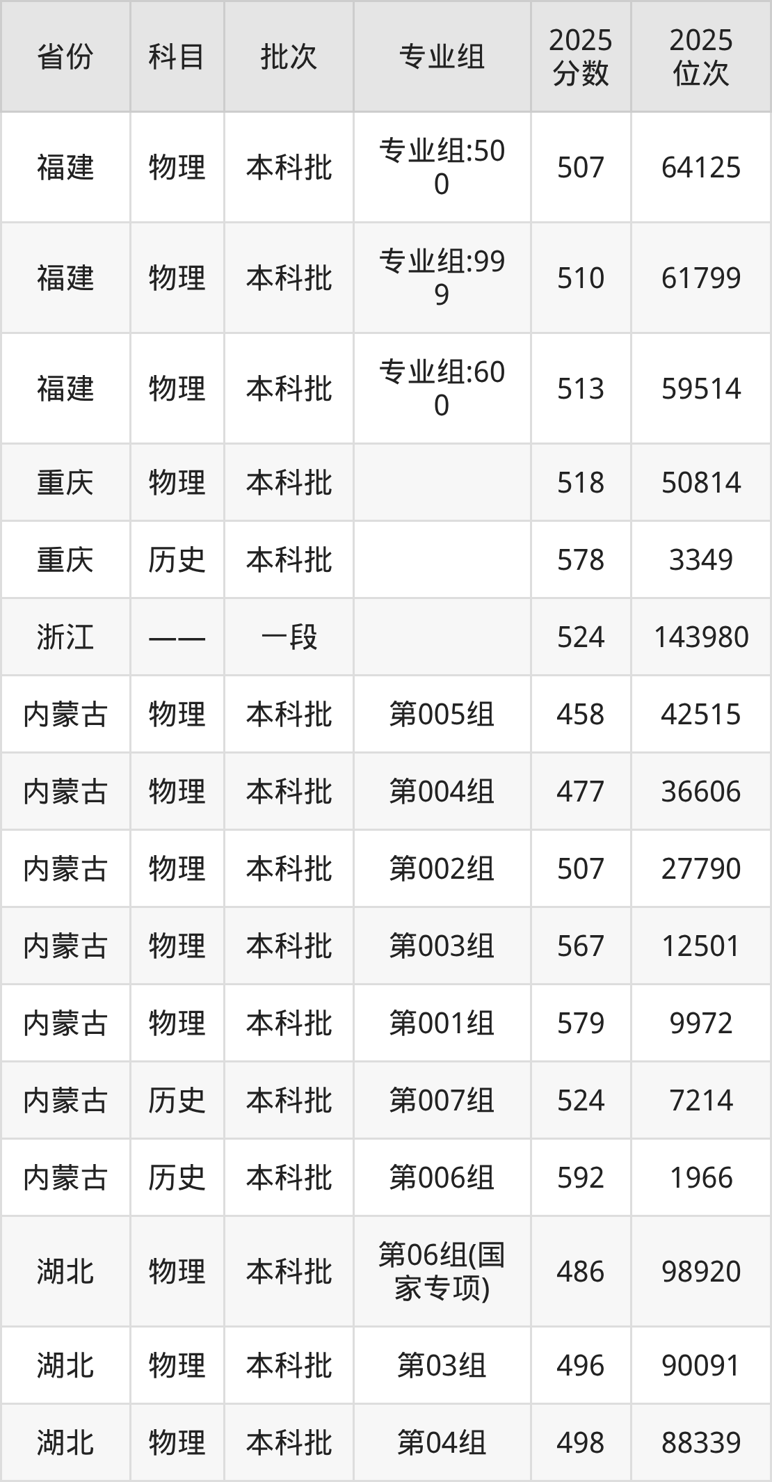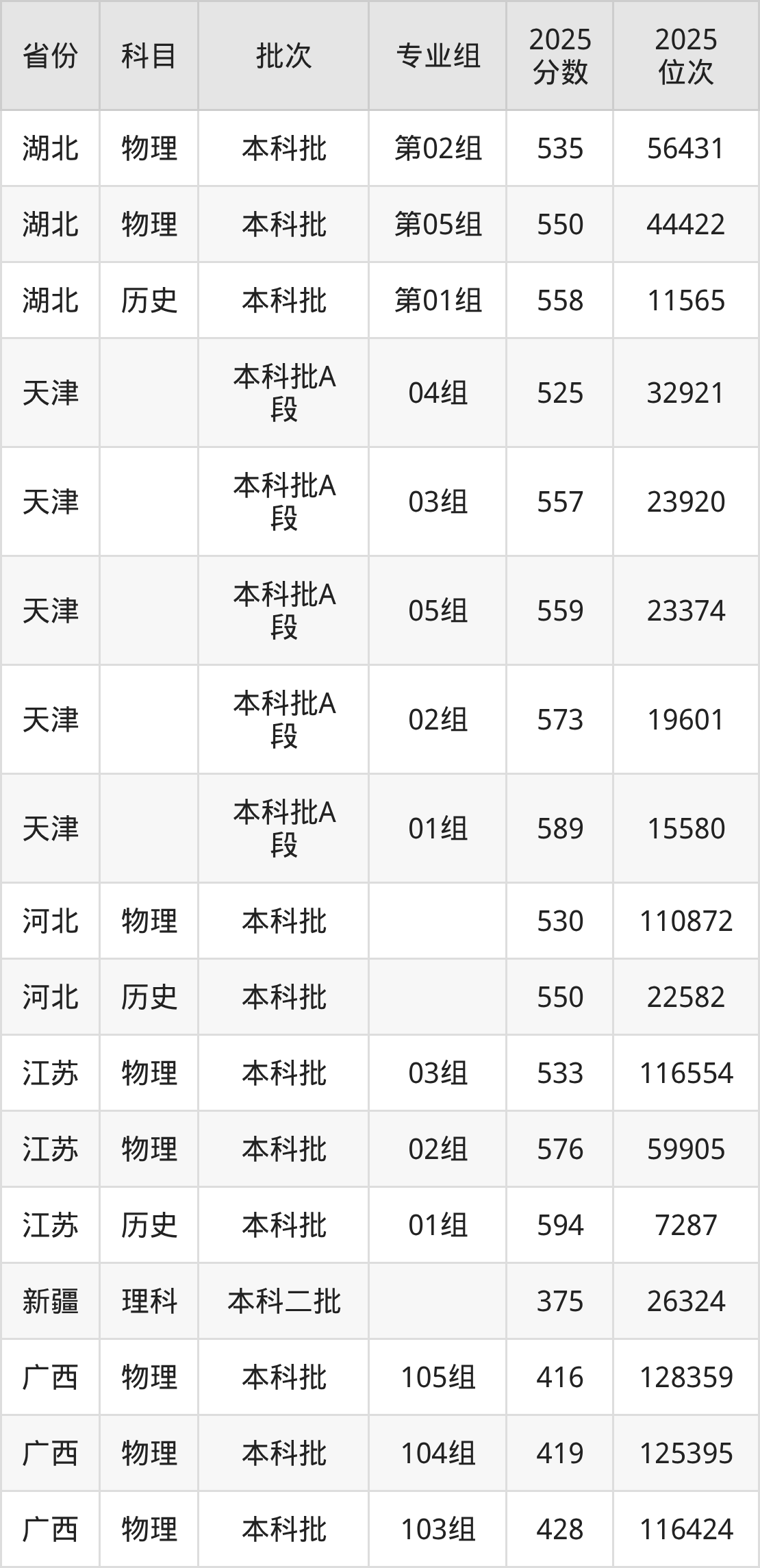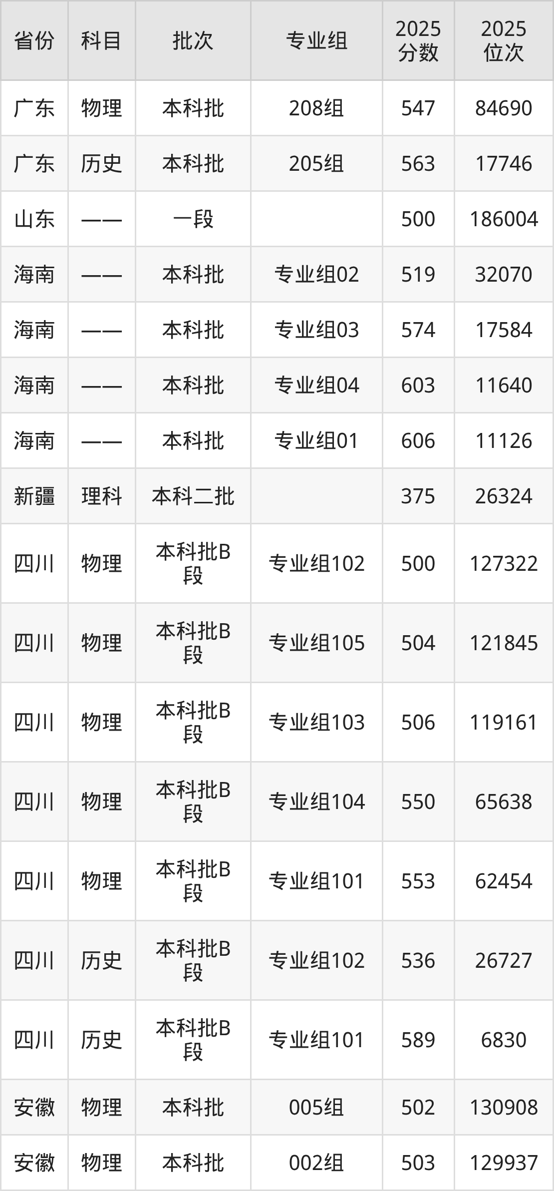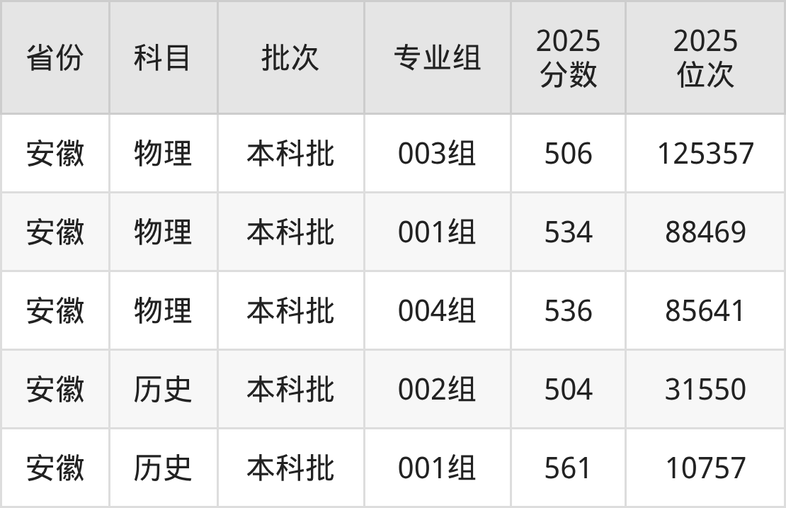 2025年在本科物理类进行招生,各专业组分数线详情如下:
