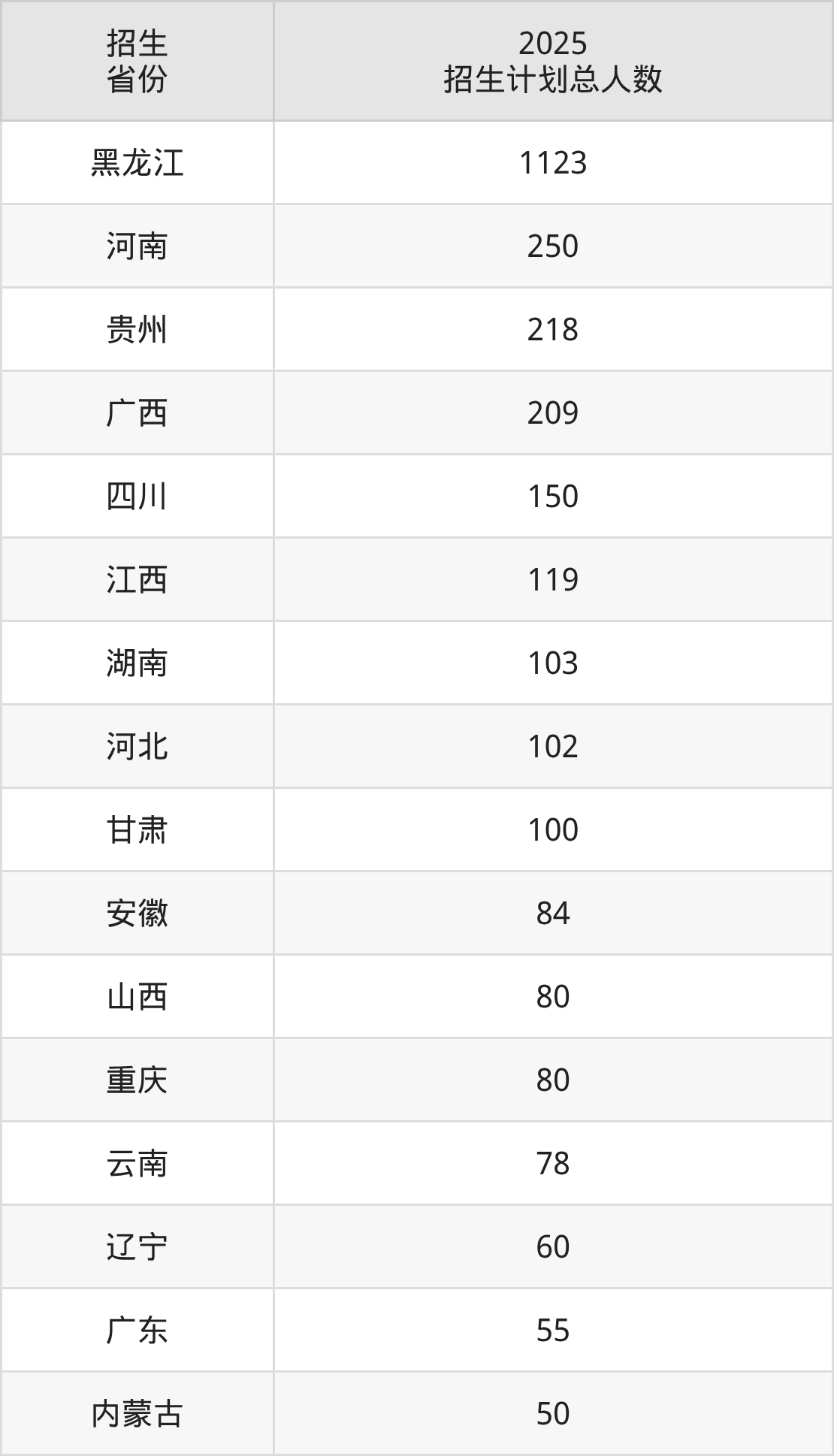 2025年黑龙江中医药大学面向全国25个省市开展本科招生;招生专业共26个,招生人数共3144人。2025年在黑龙江省招生计划总人数是1123人,其中,黑龙江中医药大学在黑龙江省招生人数最多的是针灸推拿学。黑龙江中医药大学在各省具体招生人数情况如下表。