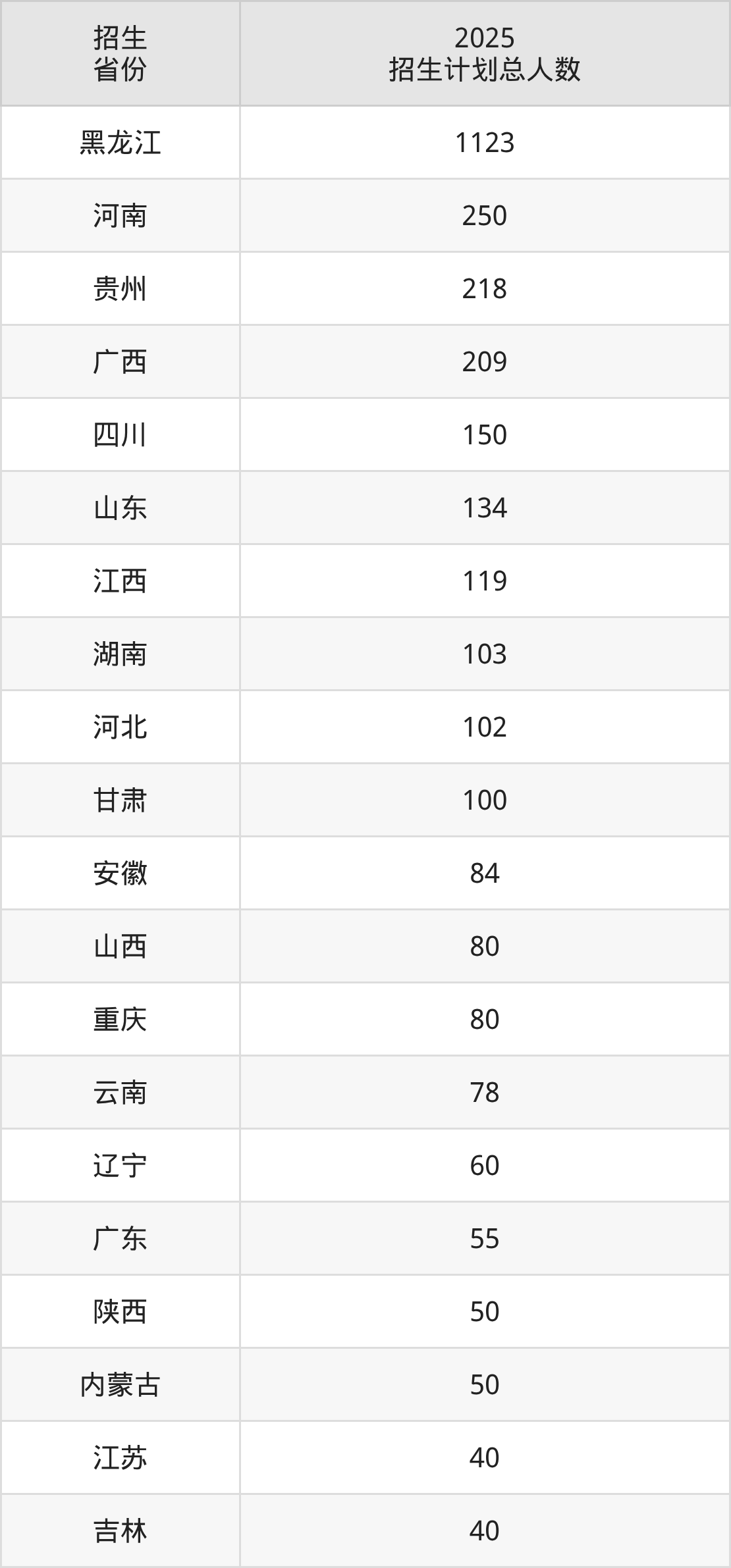 2025年黑龙江中医药大学面向全国26个省市开展本科招生;招生专业共26个,招生人数共3278人。2025年在黑龙江省招生计划总人数是1123人,其中,黑龙江中医药大学在黑龙江省招生人数最多的是针灸推拿学。黑龙江中医药大学在各省具体招生人数情况如下表。