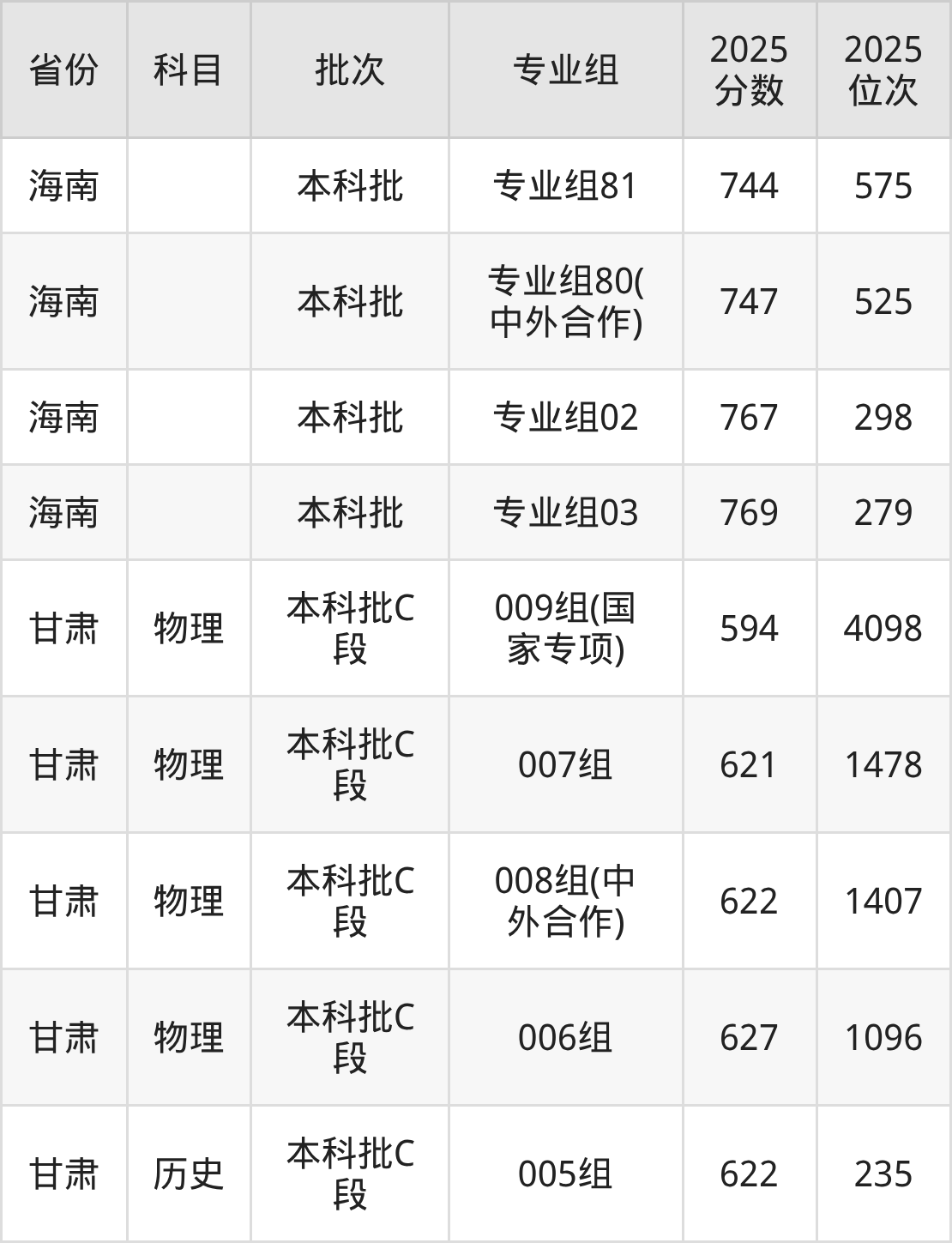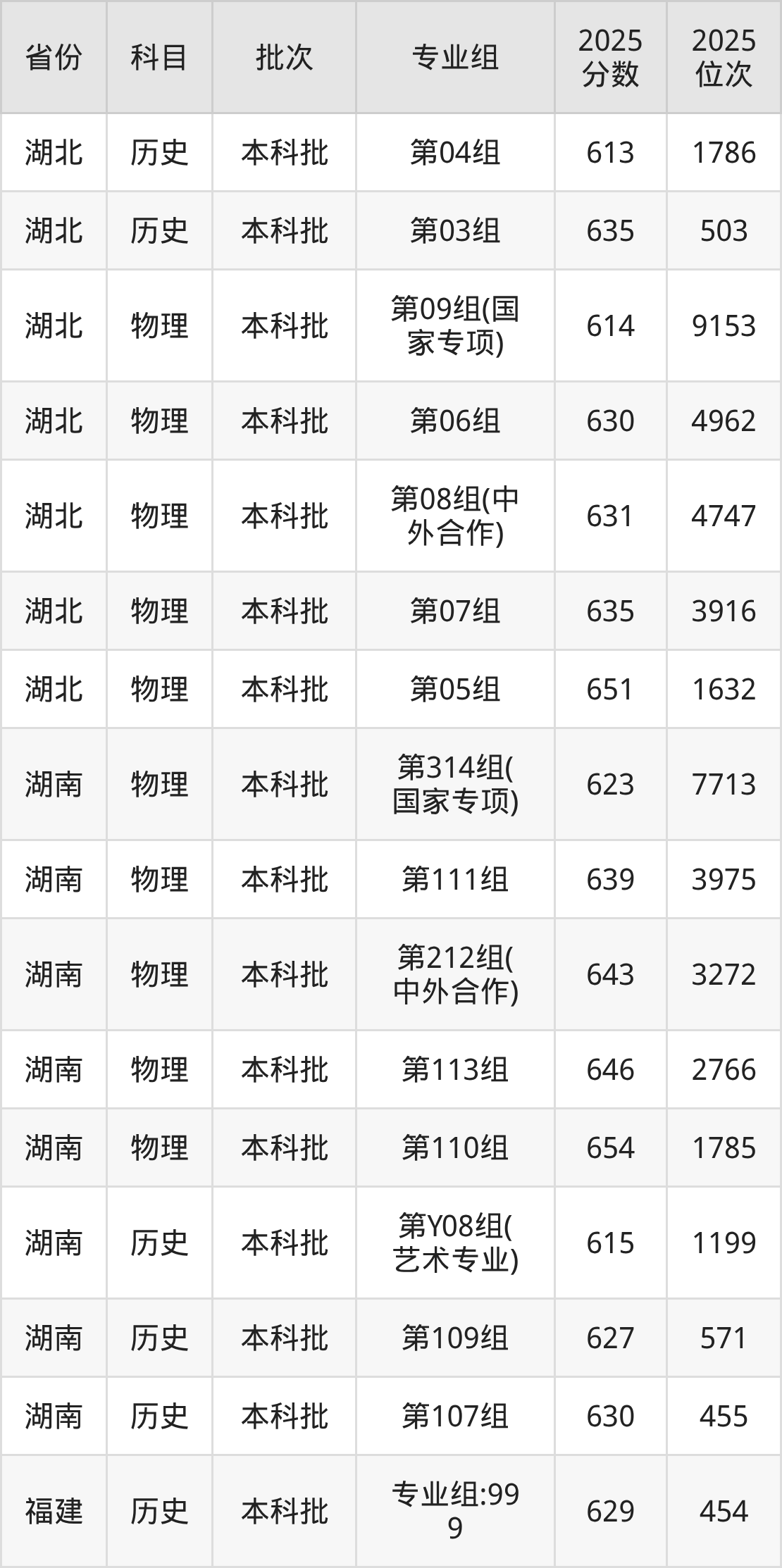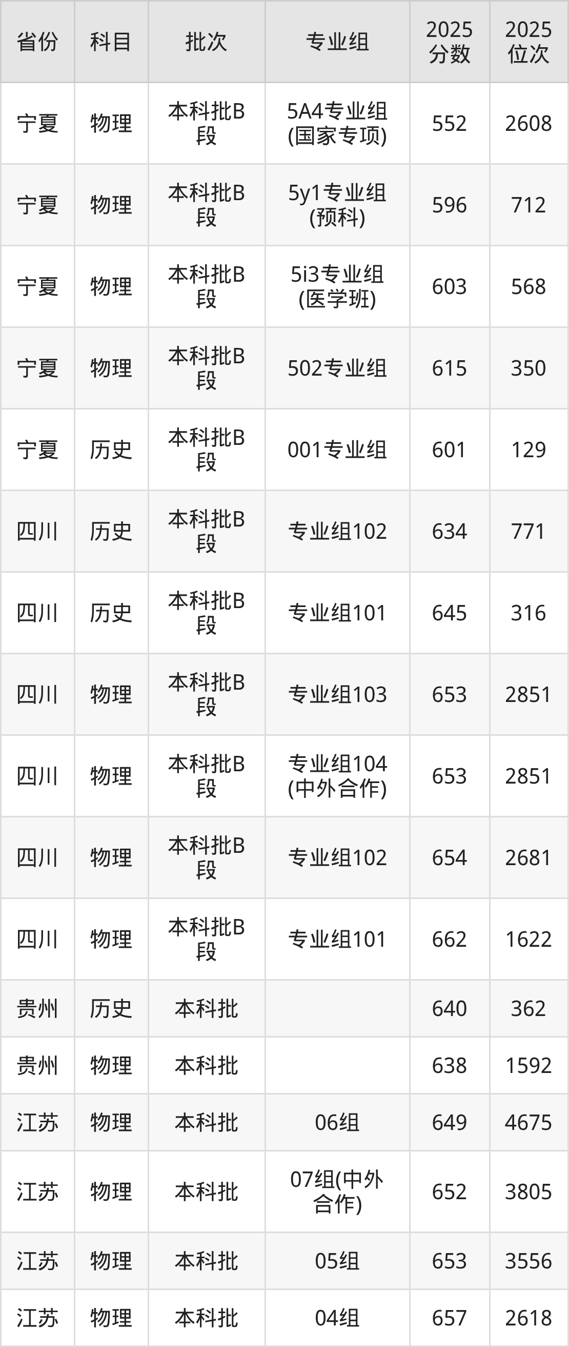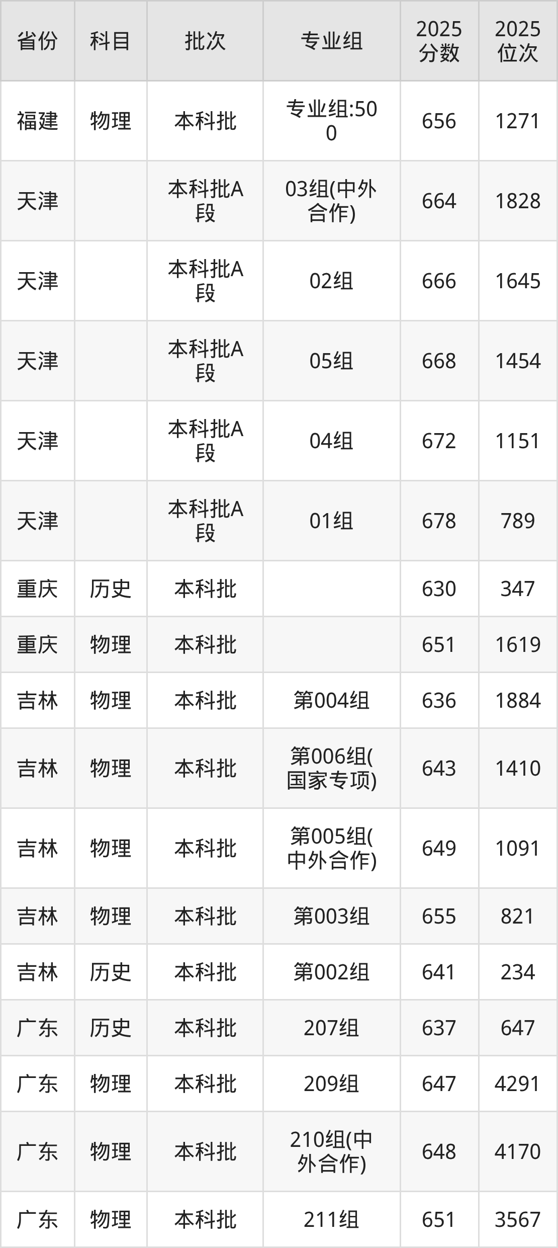 理科试验班(含双学位:金融学-数学)(光电信息科学与工程-物理)(微电子科学与工程-物理)(土木工程-数学)(环境工程-数学)(交通工程-数学)(测绘工程-物理)(能源与动力工程-化学)(建筑学-物理)(地质工程-物理)(含物理学、数学、化学、力学拔尖学生培养基地)(先进材料拔尖班):2025年投档录取最低分为654分。