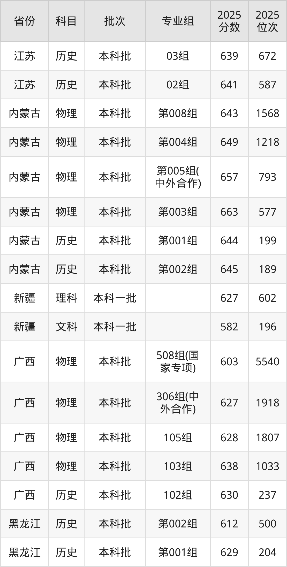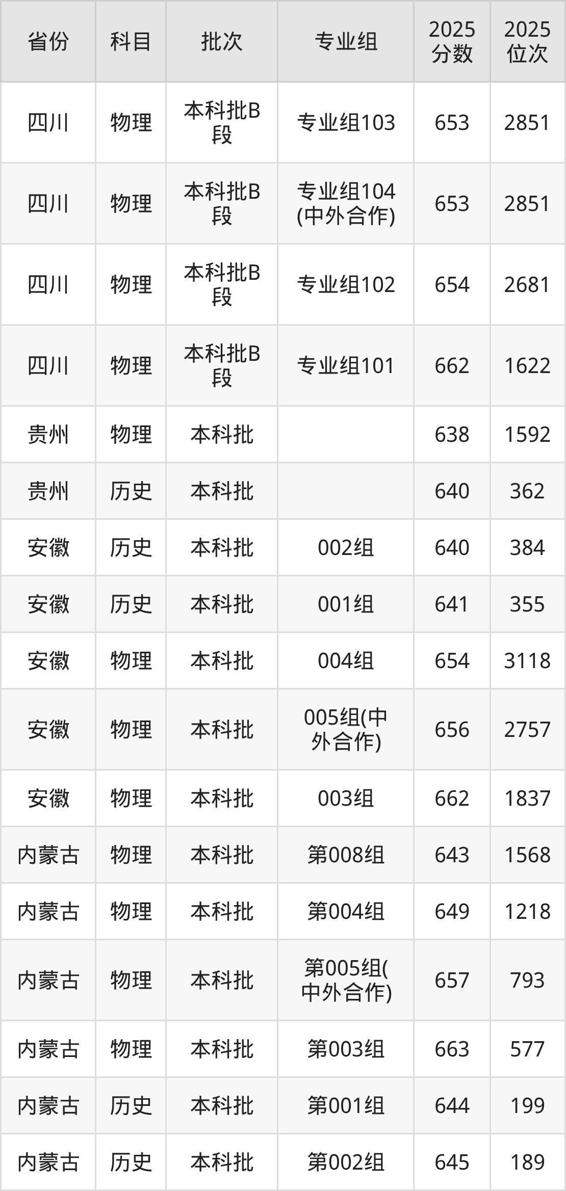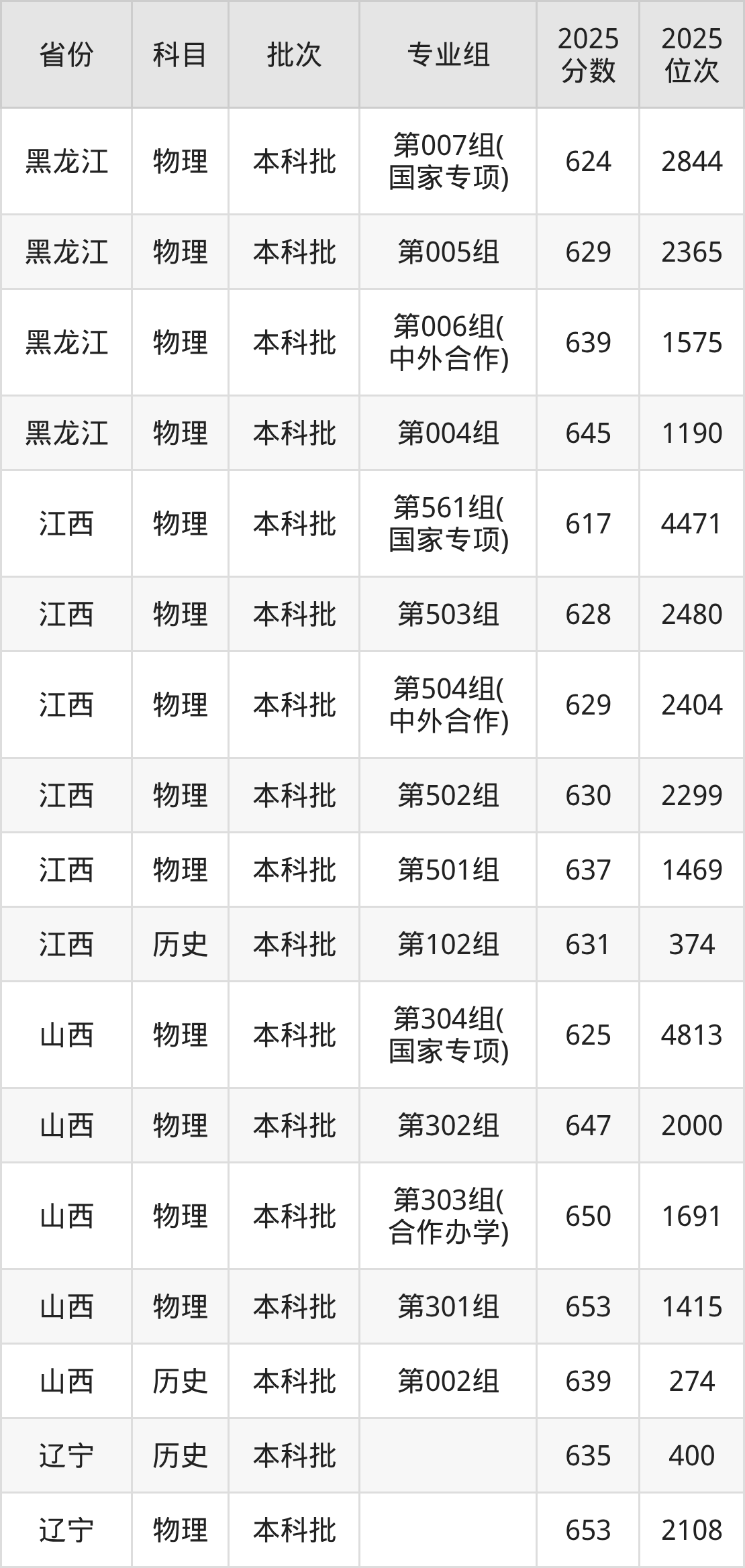 同济大学专业组104(中外合作):2025年投档录取最低分为653分,录取最低位次为2851名。