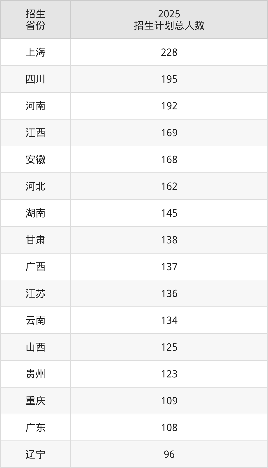 2025年同济大学面向全国28个省市开展本科招生;招生专业共33个,招生人数共3098人。2025年在上海市招生计划总人数是228人,其中,同济大学在上海市招生人数最多的是康复物理治疗。同济大学在各省具体招生人数情况如下表。