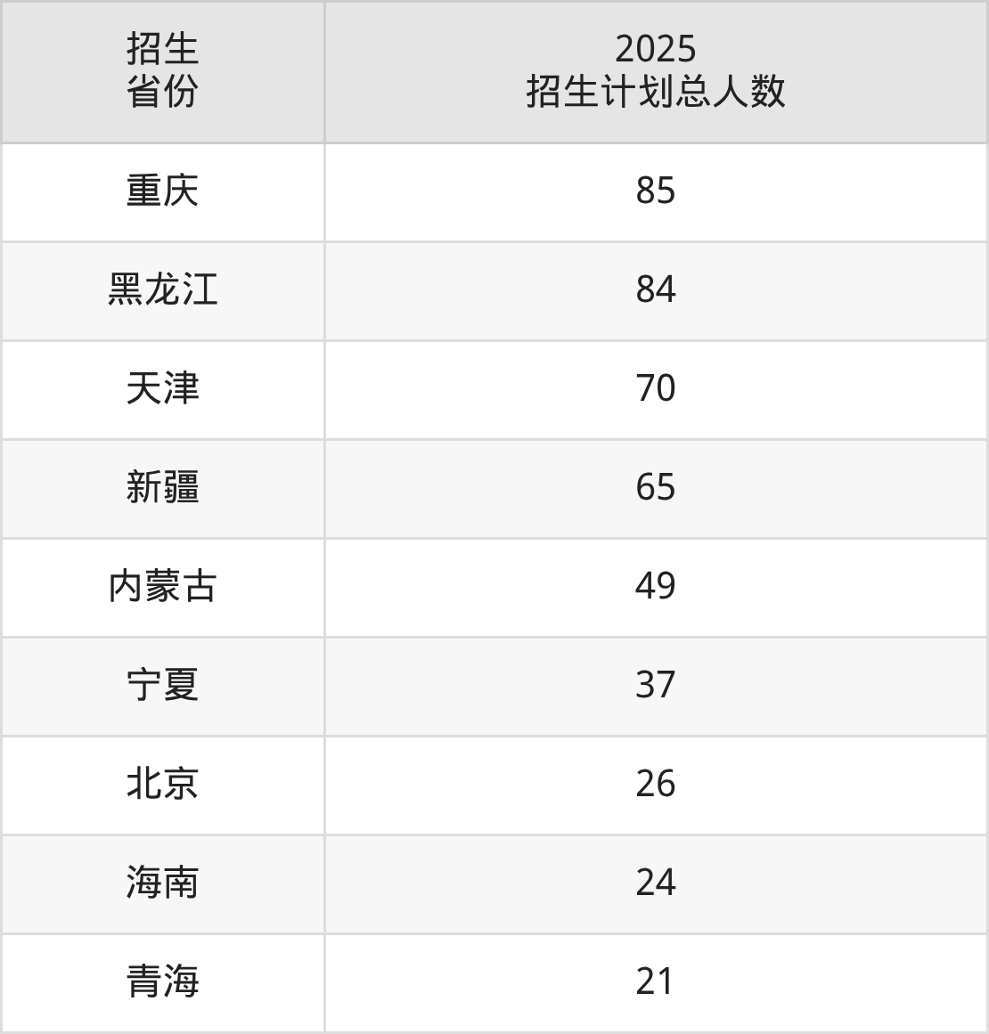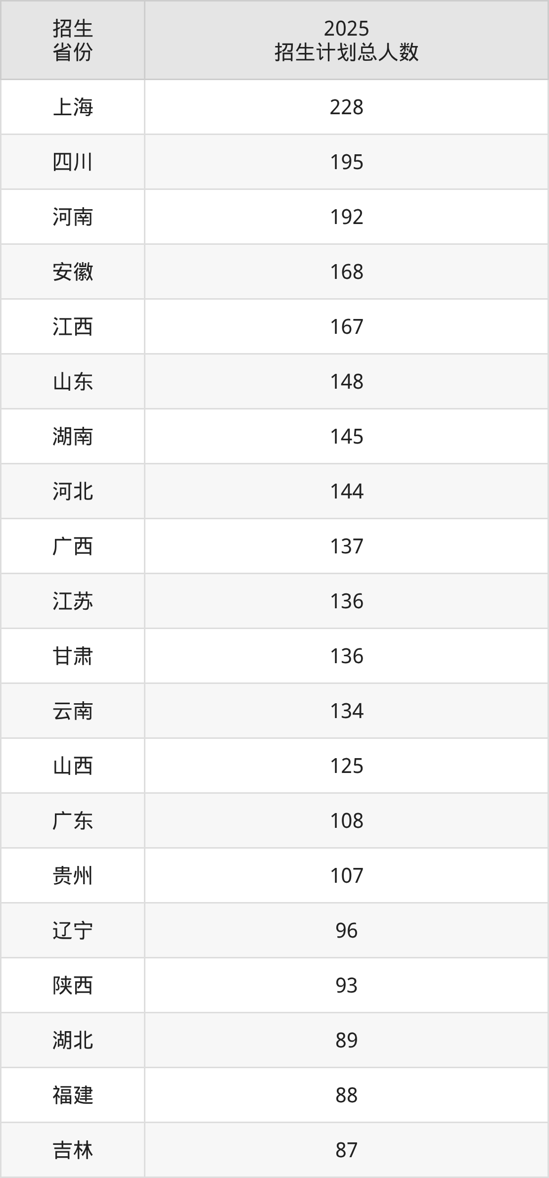 2025年同济大学面向全国29个省市开展本科招生;招生专业共32个,招生人数共3184人。2025年在上海市招生计划总人数是228人,其中,同济大学在上海市招生人数最多的是康复物理治疗。同济大学在各省具体招生人数情况如下表。