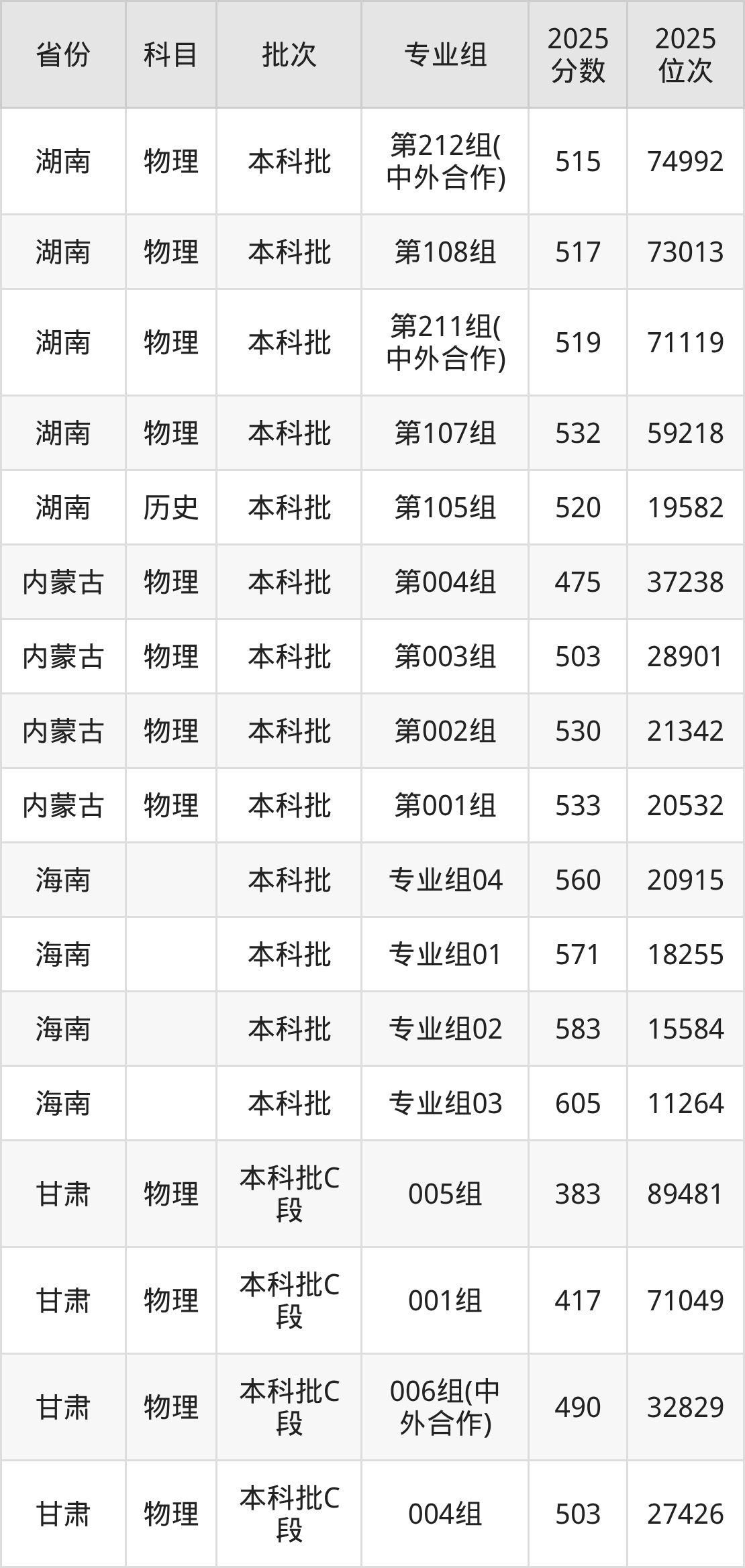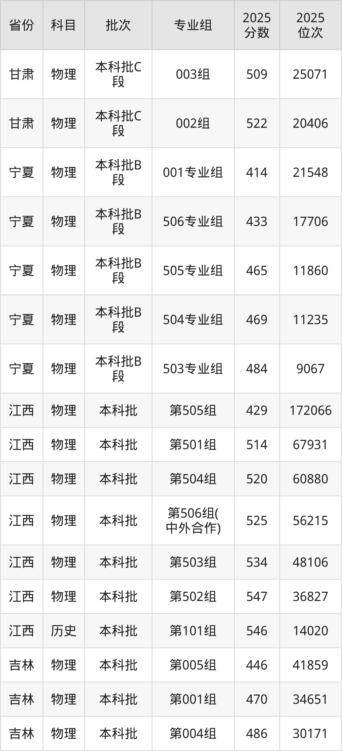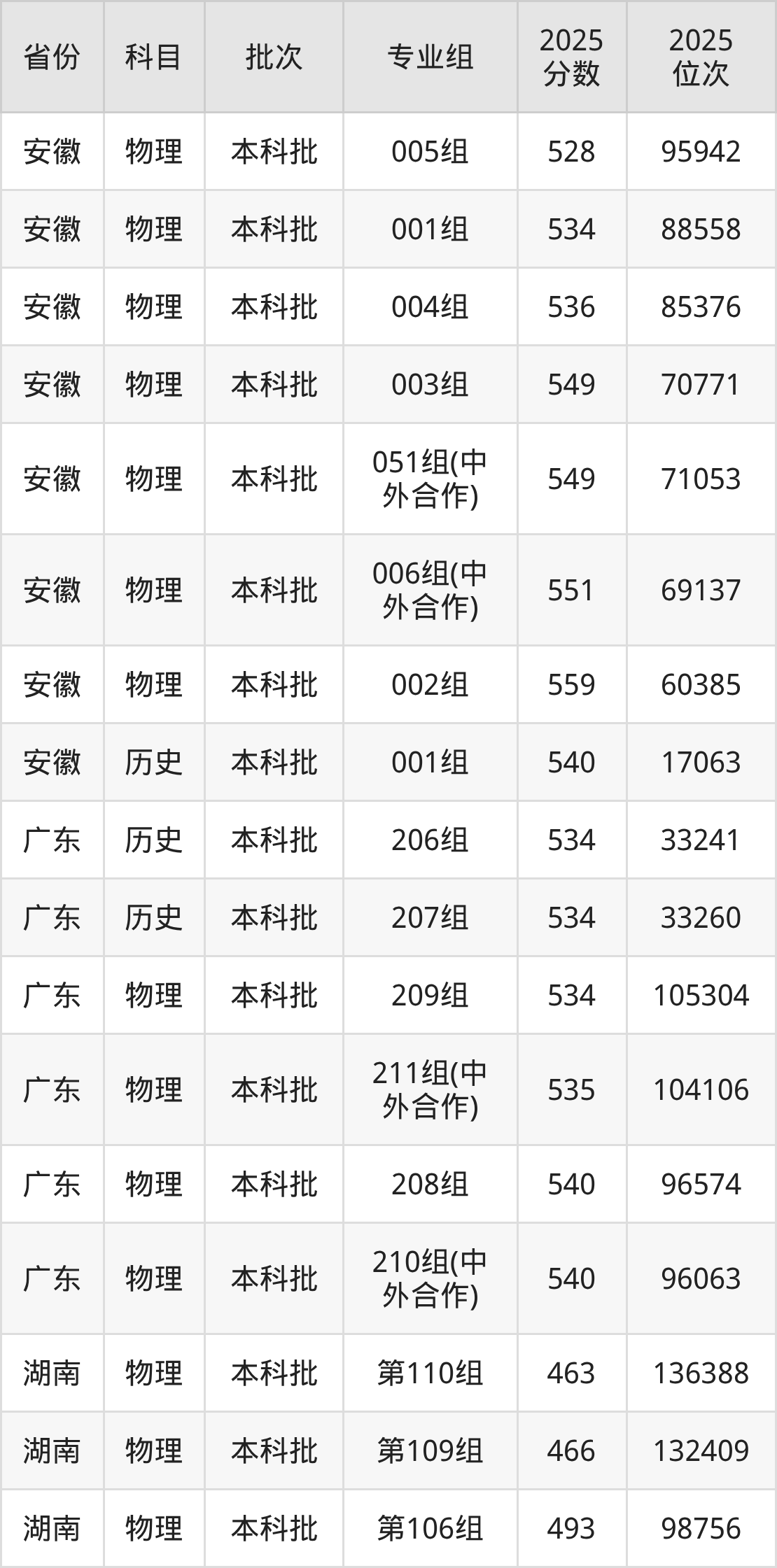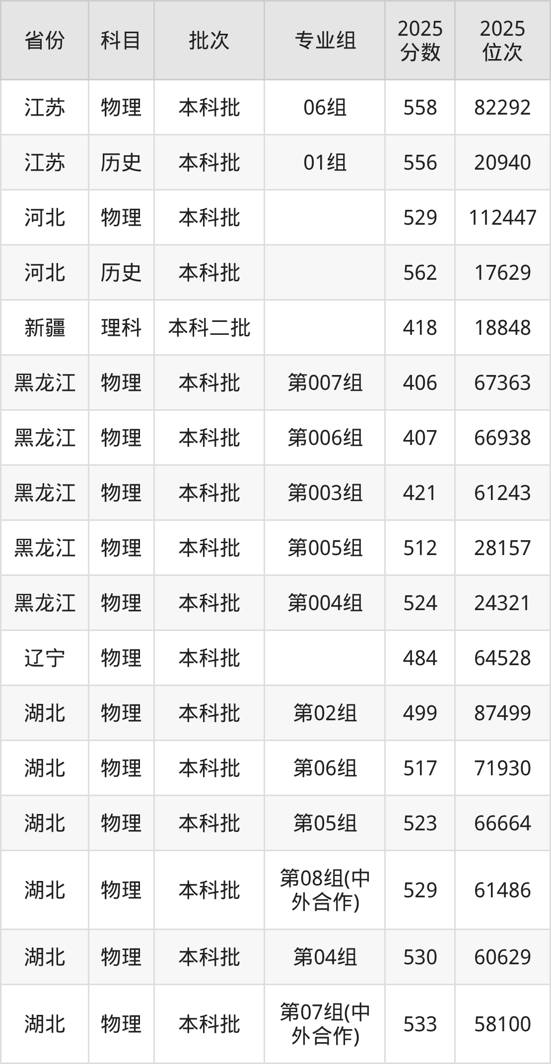 2025年在本科物理类进行招生,各专业组分数线详情如下: