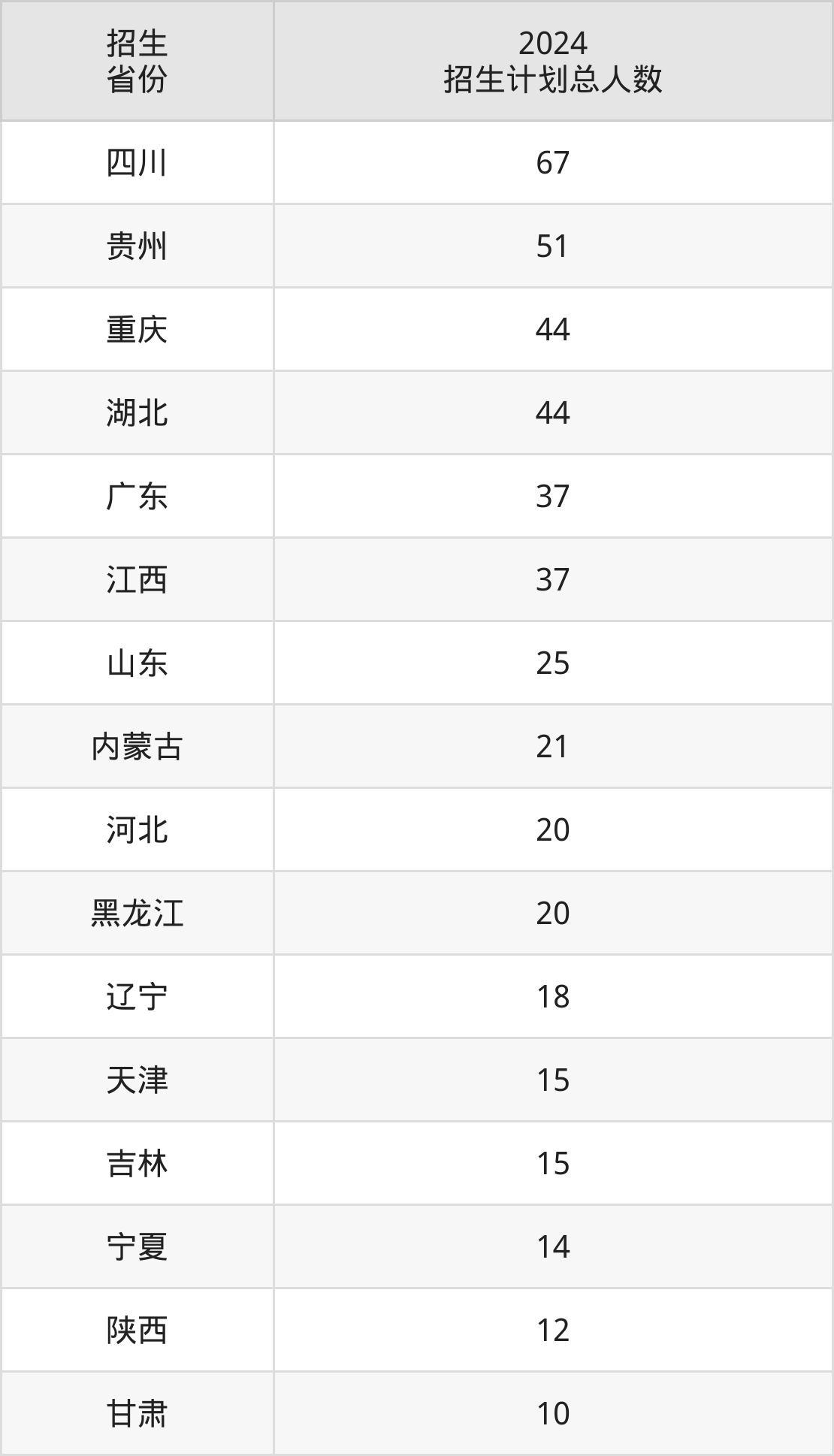 2024年武警警官学院面向全国16个省市开展本科招生;招生专业共11个,招生人数共450人。2024年在四川省招生计划总人数是67人,其中,武警警官学院在四川省招生人数最多的是思想政治教育。武警警官学院在各省具体招生人数情况如下表。
