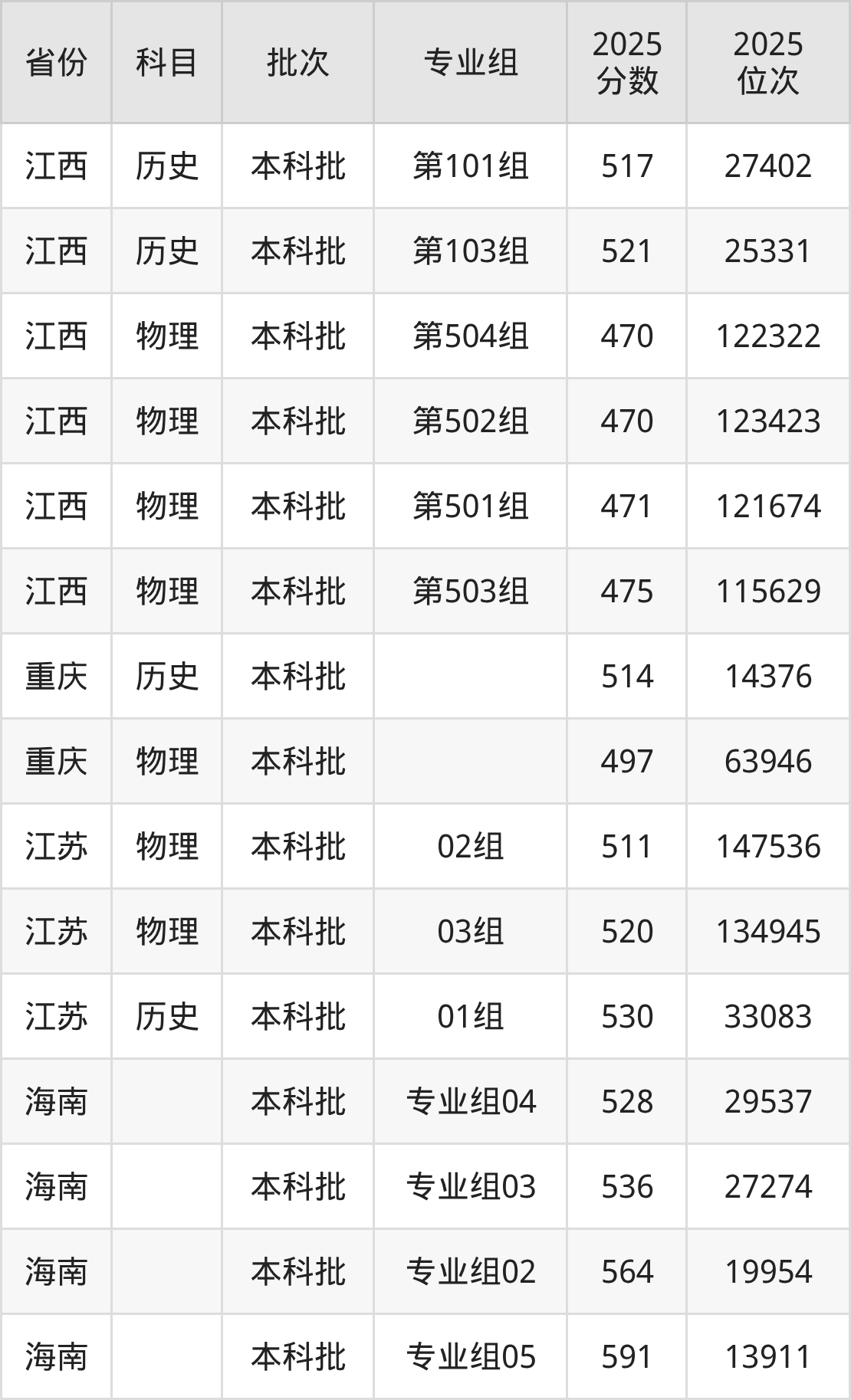 2025年景德镇学院全国录取分数线是334分到591分,录取最低在新疆理科、录取最高在海南(专业组05)。各省各专业组最低分具有差异,详情如下: